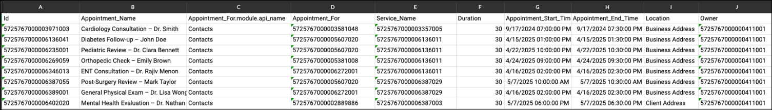 { "data": [ { "Appointment_Name": "General Consultation", "Owner": { "name": "Patricia Boyle", "id": "5725767000000411001", }, "Appointment_Start_Time": "2025-04-15T13:00:00-07:00", "Appointment_End_Time": "2025-04-15T13:30:00-07:00", "Appointment_For": { "module": { "api_name": "Contacts", "id": "5725767000000002179" }, "name": "John Doe", "id": "5725767000005607020" }, "Service_Name": { "name": "General Check-up", "id": "5725767000006387029" }, "Location": "Business Address" } ] } |
