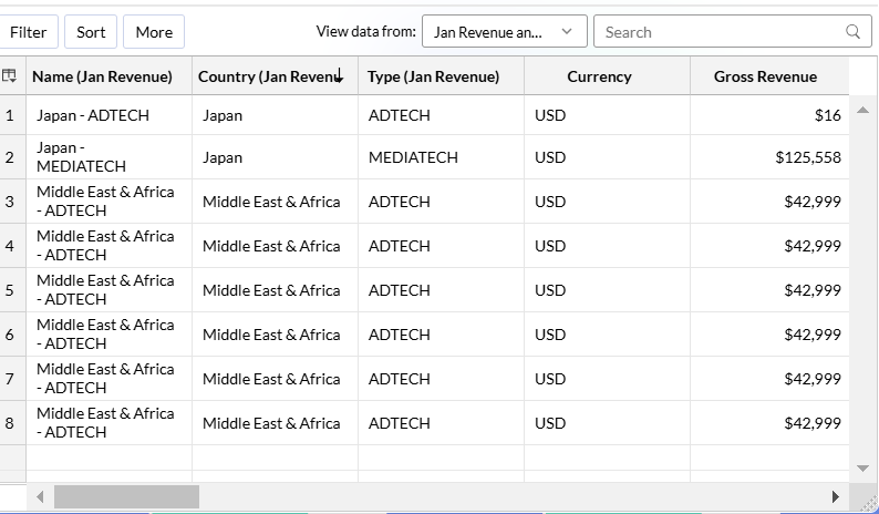 This is the underlying data for the chart I created. As you can see, the Middle East & Africa region gets duplicated due to the countries listed in the lookup value column.