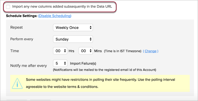 Sí, las nuevas columnas que se agreguen en la tabla de origen se pueden agregar automáticamente a la tabla de Zoho Analytics a la que se agregan los datos. Para ello, debe seleccionar la opción Importar las columnas nuevas agregadas posteriormente en la URL de datos en el programador.
