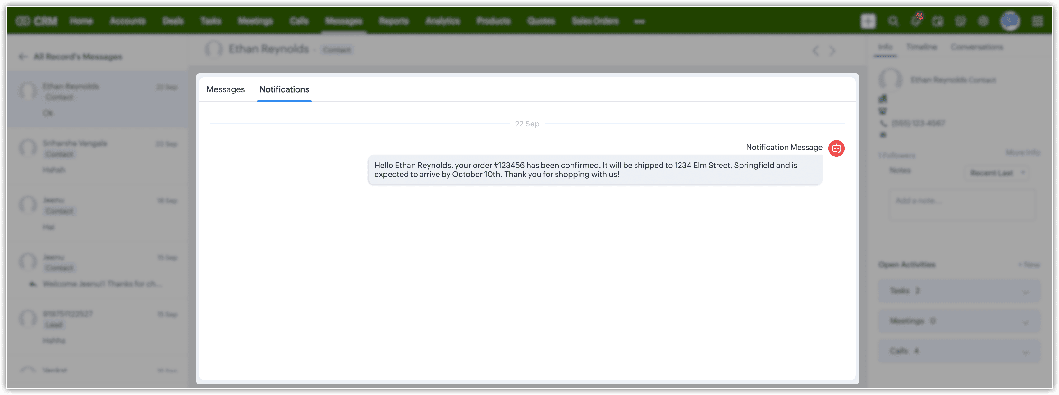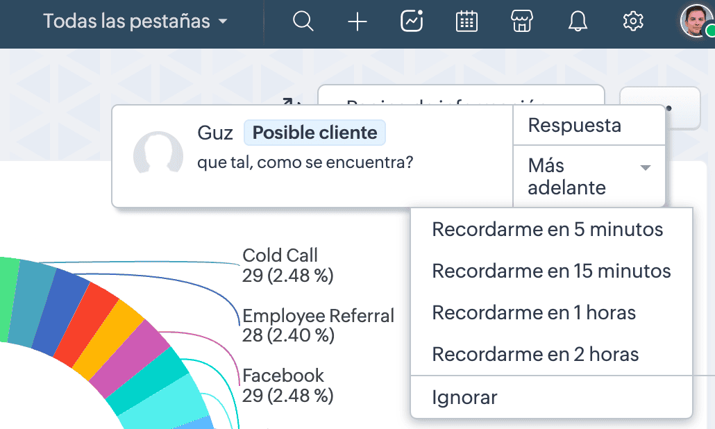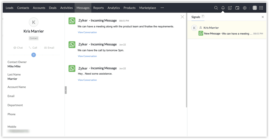 Cuando un cliente potencial o un contacto existente envía un mensaje comercial al número de WhatsApp de su empresa, se envía una notificación al usuario de CRM a través de SalesSignal y una ventana emergente.