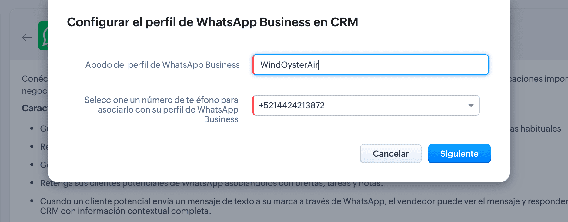 En la ventana emergente Configurar perfil de WhatsApp Business en CRM: