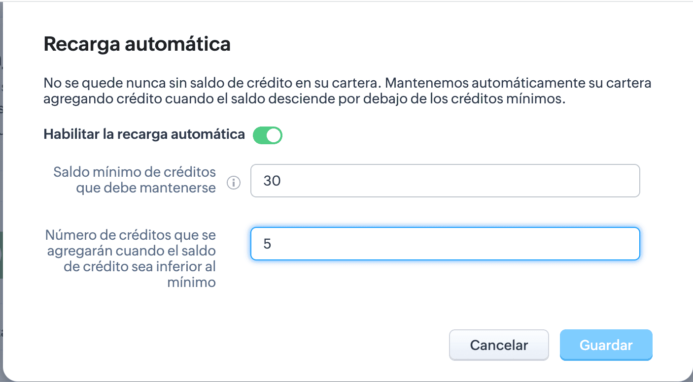 Los mensajes enviados por la empresa se cobran. Puede comprar créditos en función a la frecuencia de uso para que los cargos se deduzcan automáticamente. Tras la compra inicial de créditos, puede utilizar la opción de recarga automática para evitar quedarse sin saldo estableciendo el número mínimo de créditos que debe mantener en su cuenta en cualquier momento. También se puede establecer el número de créditos que deben comprarse cuando se agote el límite.