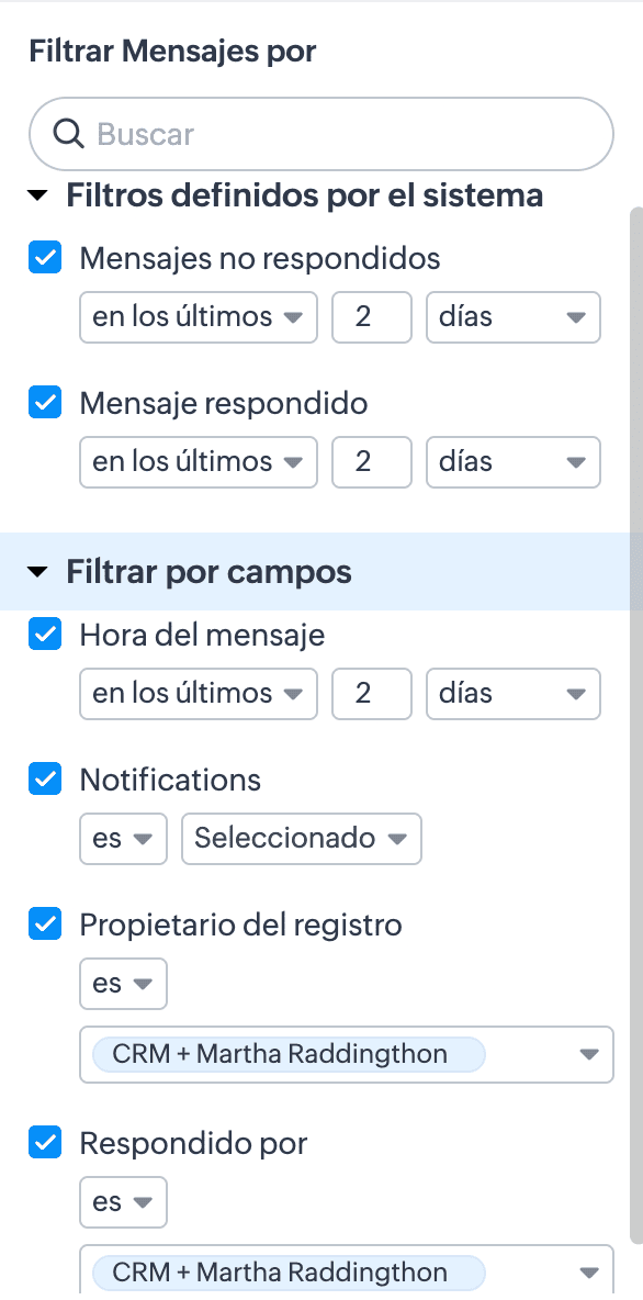 En el módulo Mensajes los usuarios pueden utilizar los siguientes filtros y establecer criterios para encontrar un mensaje rápidamente: