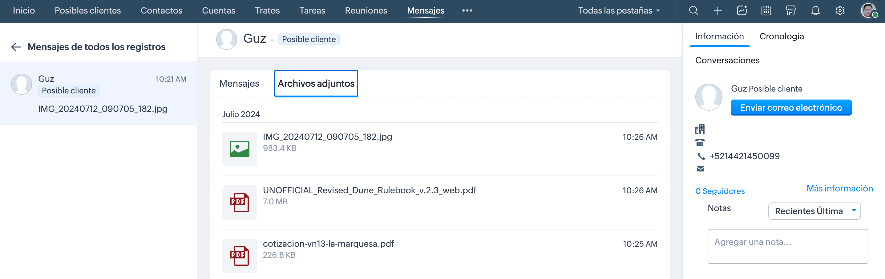 Cada pestaña de vista de conversación se divide en dos pestañas: Mensajes y Adjuntos donde se almacena la información respectiva. Puede previsualizar y descargar todos los archivos adjuntos desde aquí o desde los mensajes.