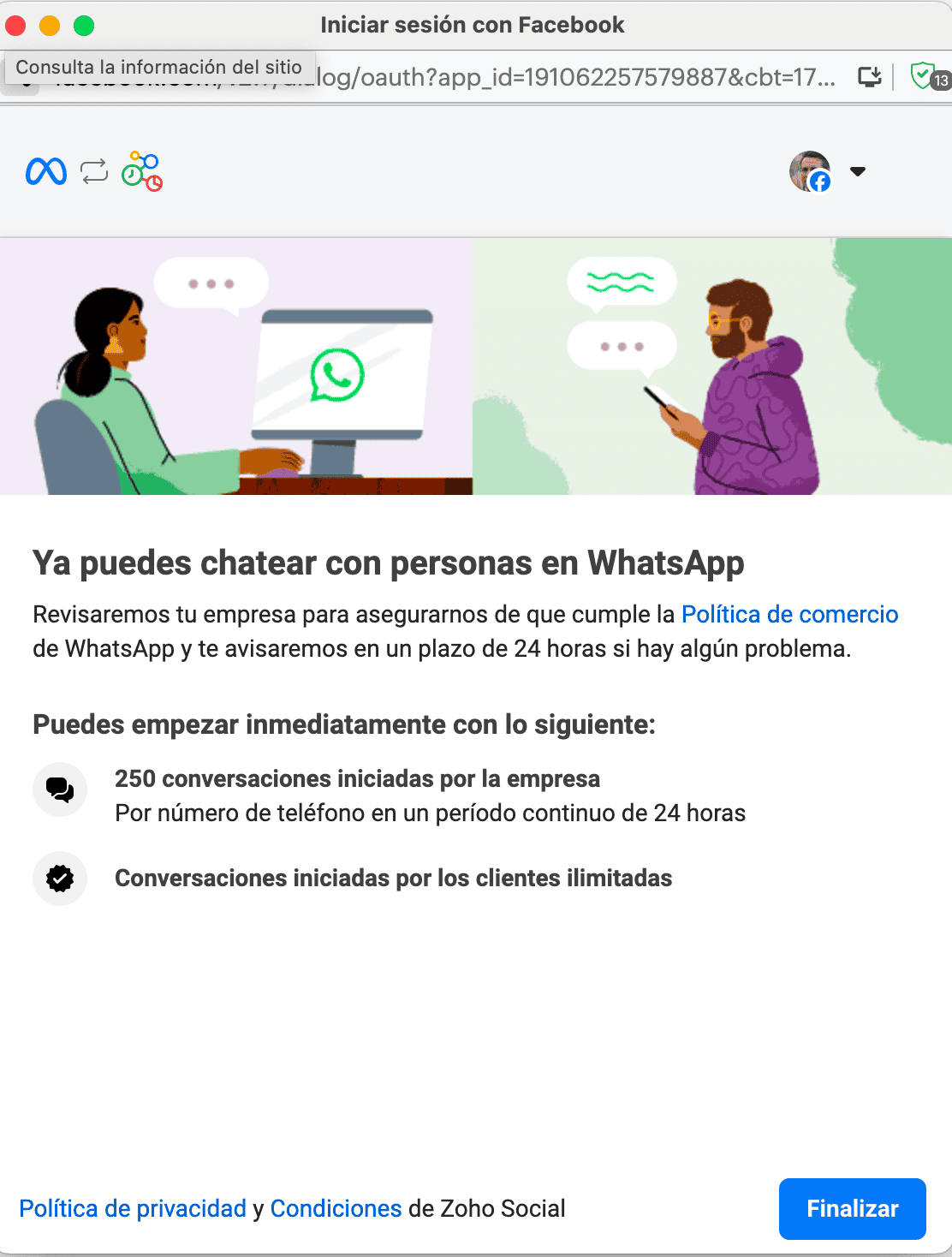 ● Una vez verificado su negocio, se revisará si cumple las Condiciones de servicio de WhatsApp y la Política de comercio de WhatsApp.