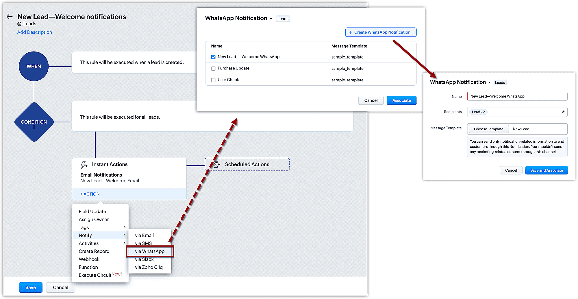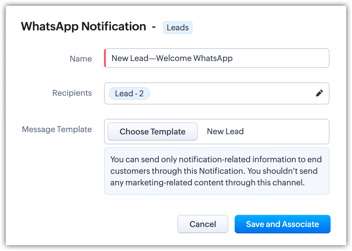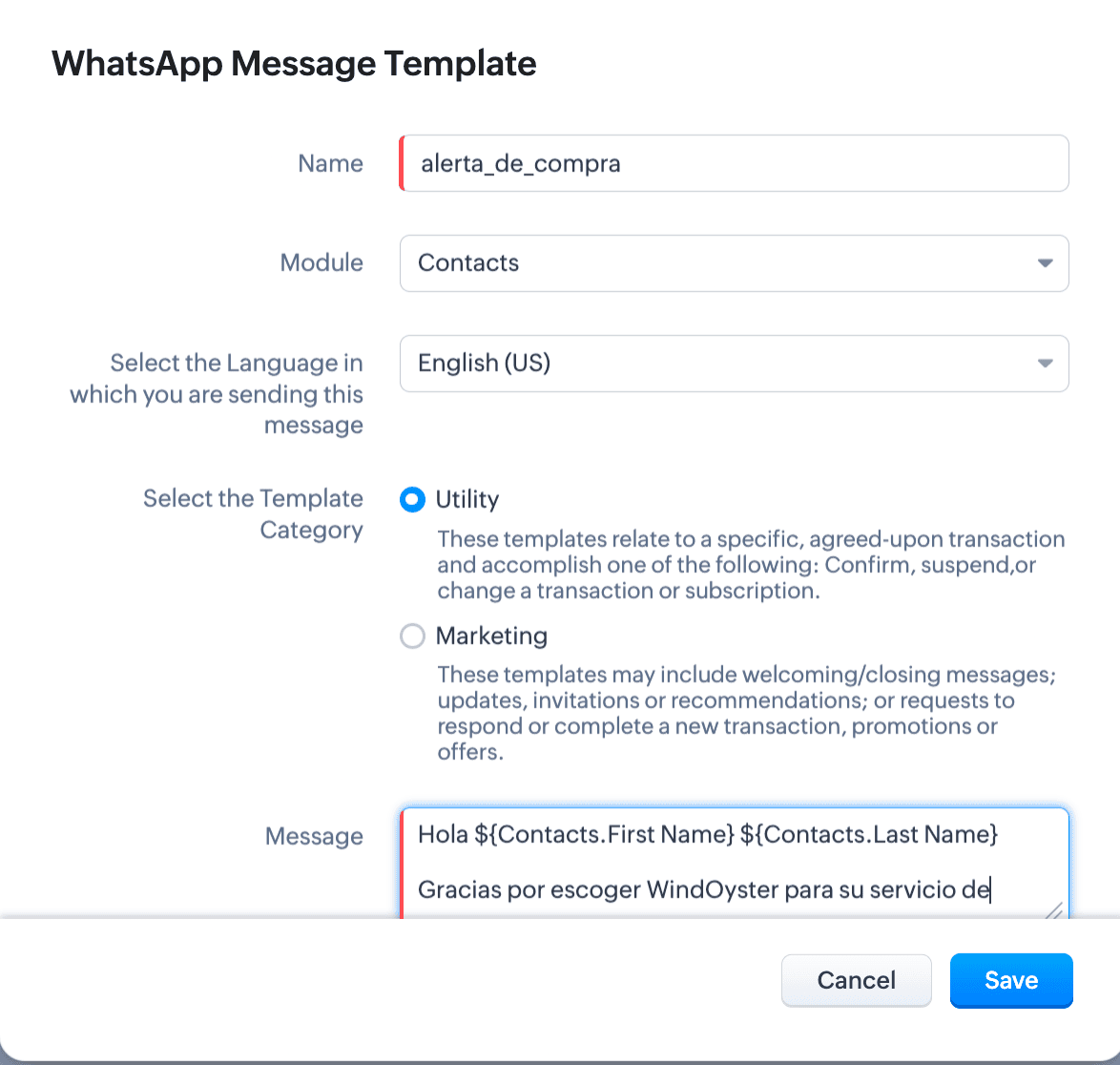 ● Sólo las plantillas aprobadas pueden utilizarse para crear notificaciones de WhatsApp en CRM.