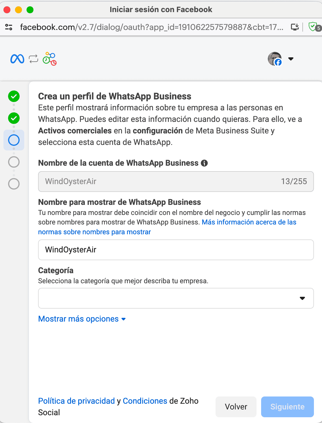 Proporcione un apodo para el perfil empresarial de WhatsApp en CRM y de clic en Siguiente.