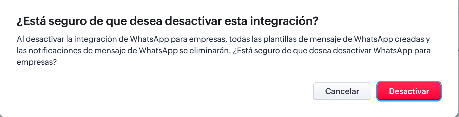 De clic en el botón Desactivar de la sección Integración de WhatsApp Business.