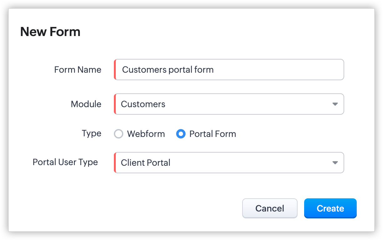 - Cambia el Tipo a Formulario de Portal y haga clic en Crear. Serás redirigido a la página del creador de formularios.