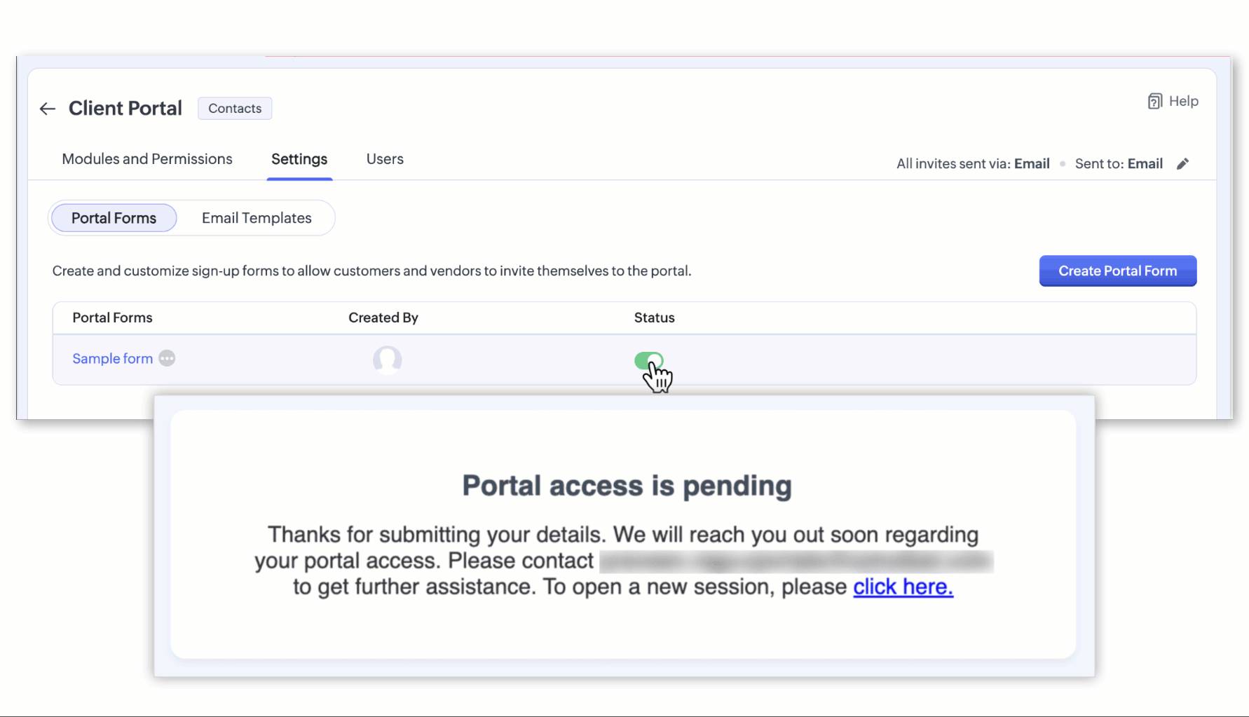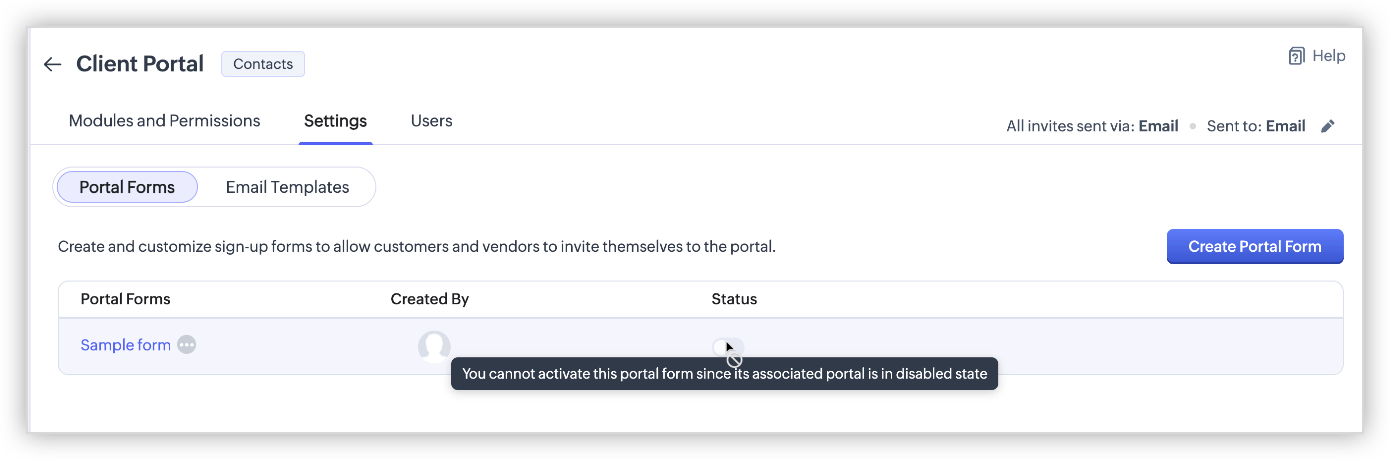 Formulario del portal desactivado: Este error aparece cuando el formulario del portal está desactivado. Como el formulario del portal está desactivado, el OTP tampoco se genera. Esto igualmente significa que no se crea ningún usuario del portal. Sin embargo, los detalles sobre el cliente se envían al usuario de Zoho CRM por correo electrónico.