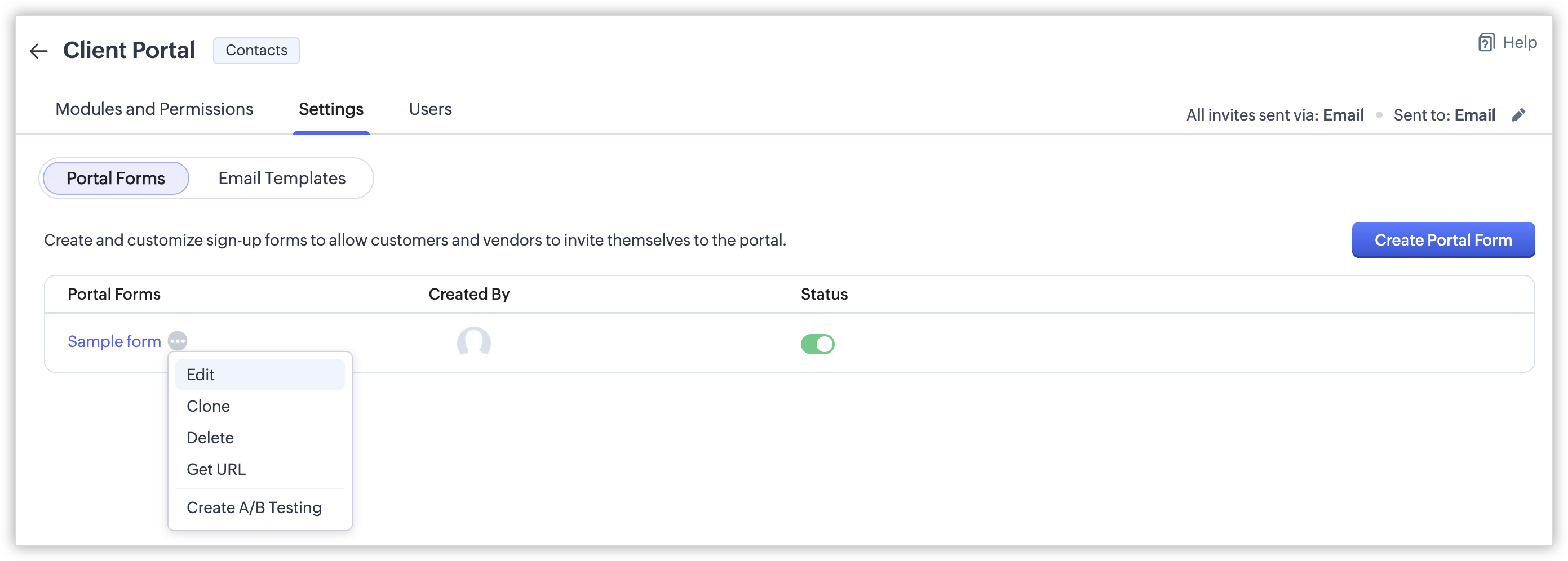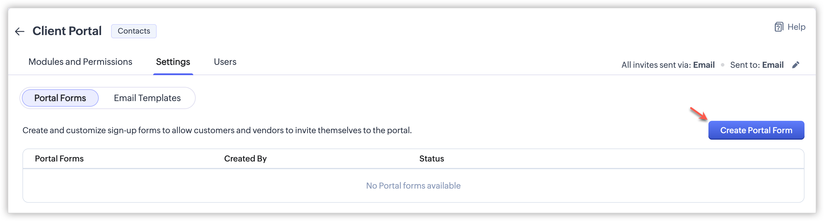El propósito principal del formulario del portal es permitir que clientes, proveedores y socios se inviten a sí mismos a la cuenta del portal de la organización. Solo los clientes válidos son añadidos a la cuenta del portal. Zoho CRM valida al cliente antes de que sea añadido a la cuenta del portal.