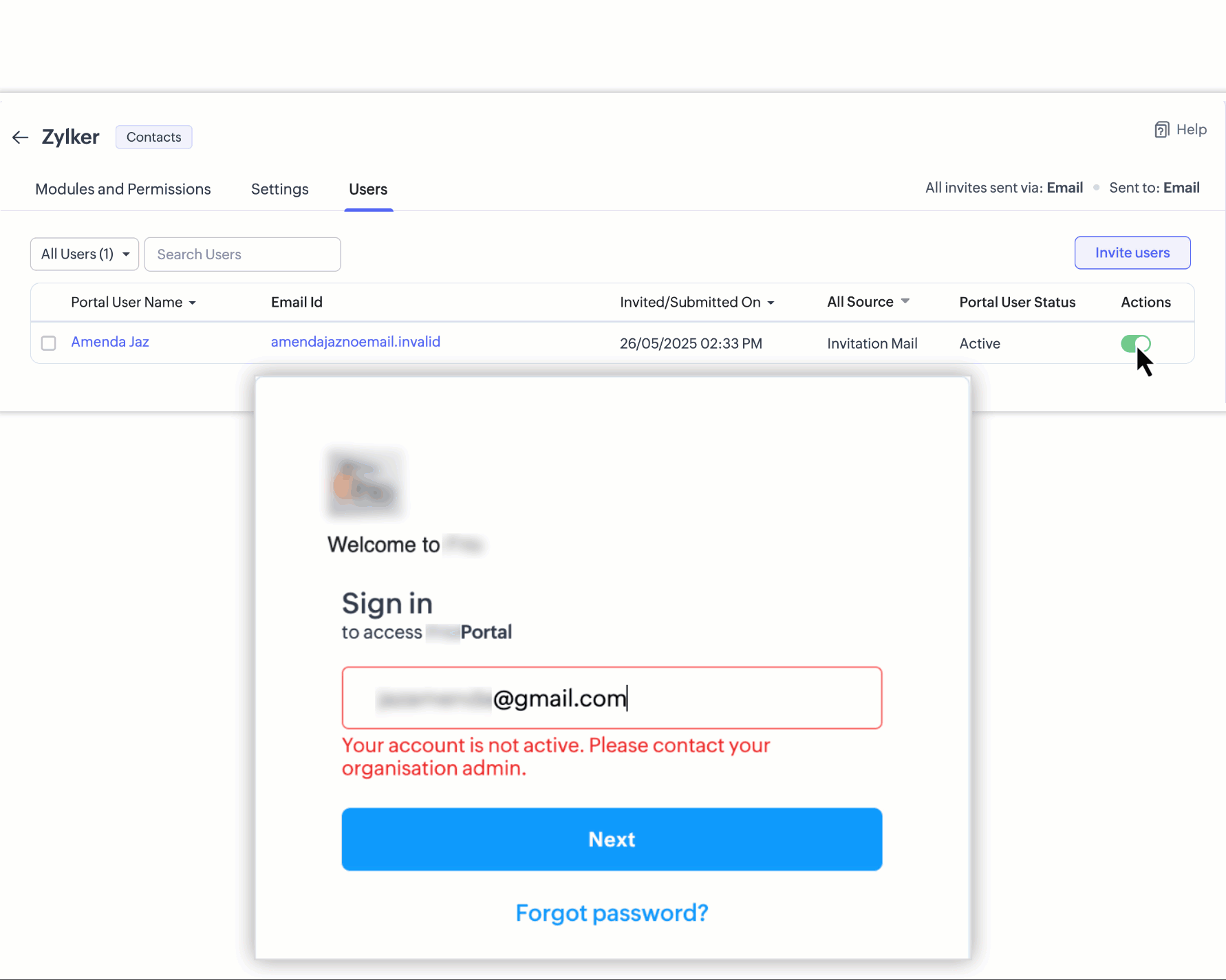Límite excedido : Este error se muestra cuando se ha superado el límite de usuarios del portal en la cuenta de Zoho CRM.