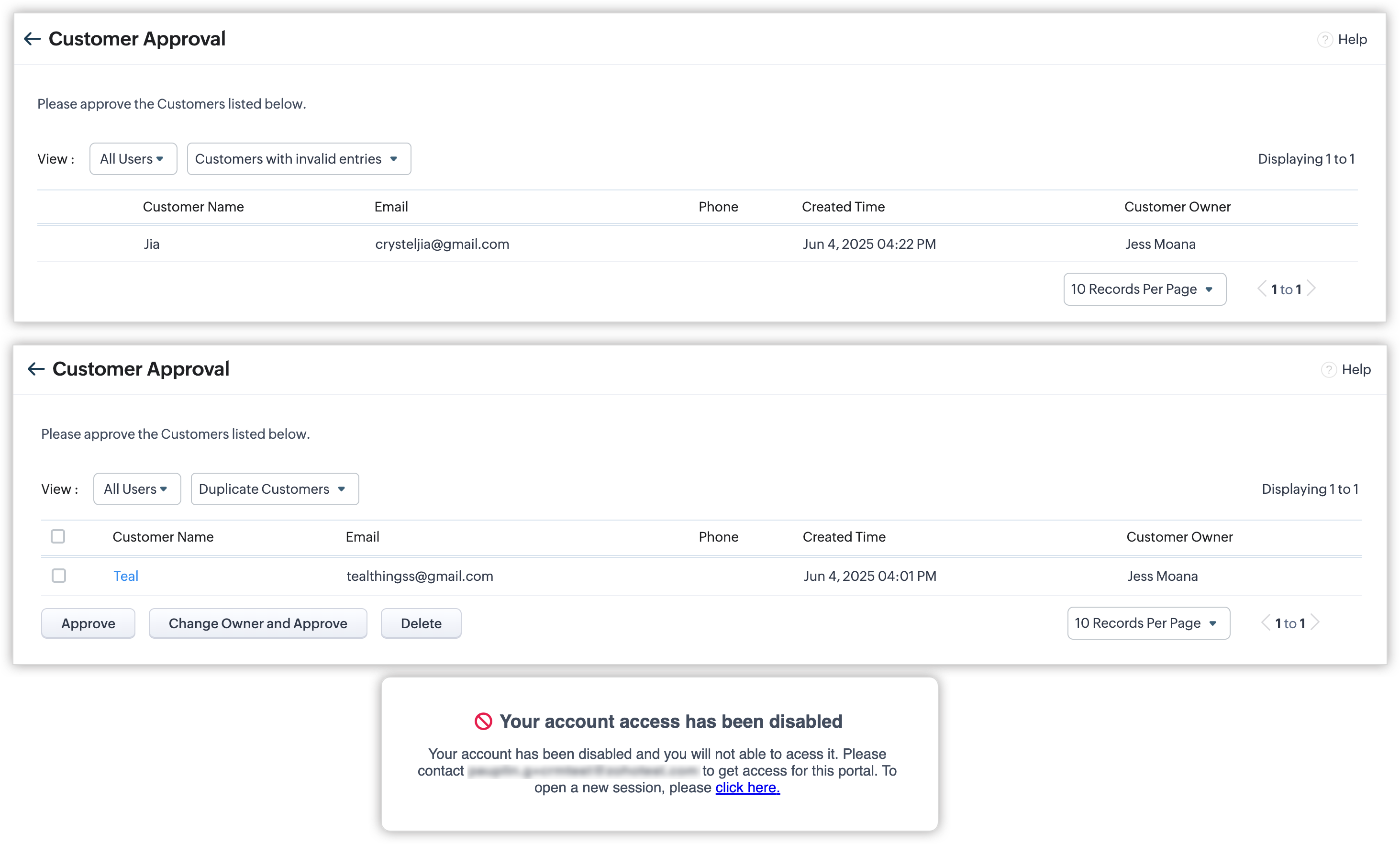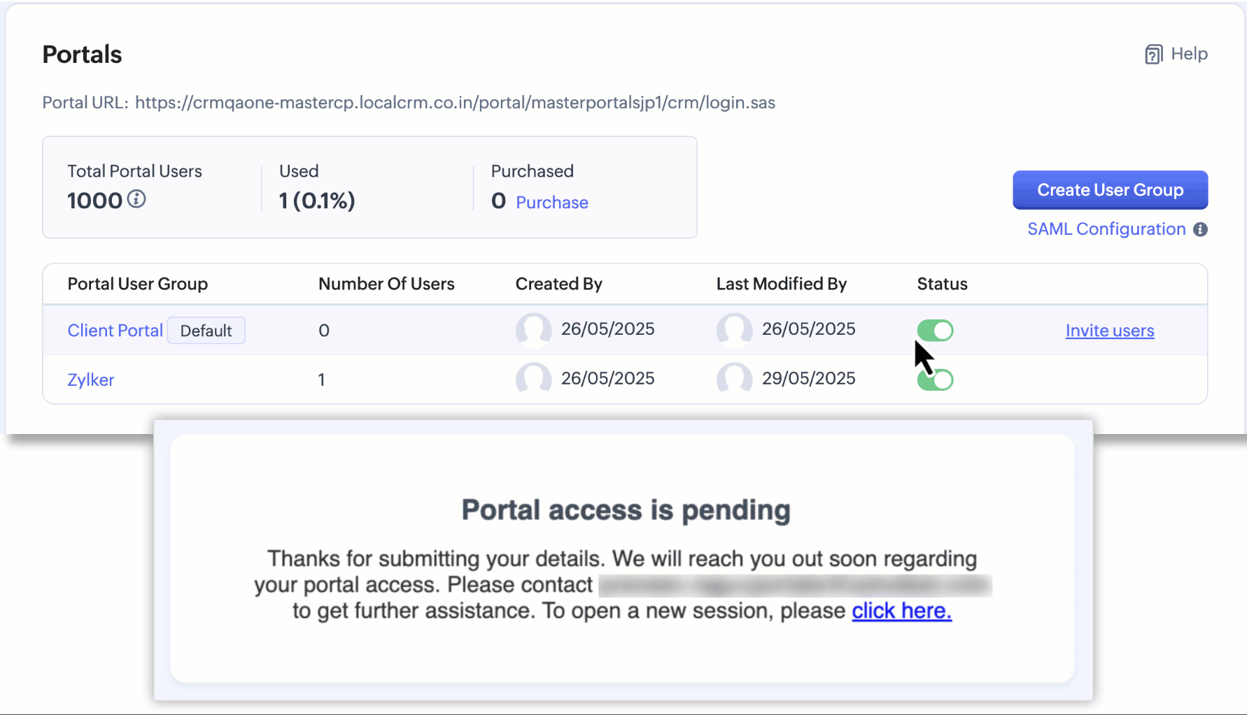 El límite máximo para En espera de acceso al portal es 100. Después de almacenar 100 registros de clientes, cualquier cliente que intente registrarse no será guardado aquí. Los detalles de esos clientes se enviarán por correo electrónico al usuario del CRM, y este tendrá que agregarlos manualmente al portal.