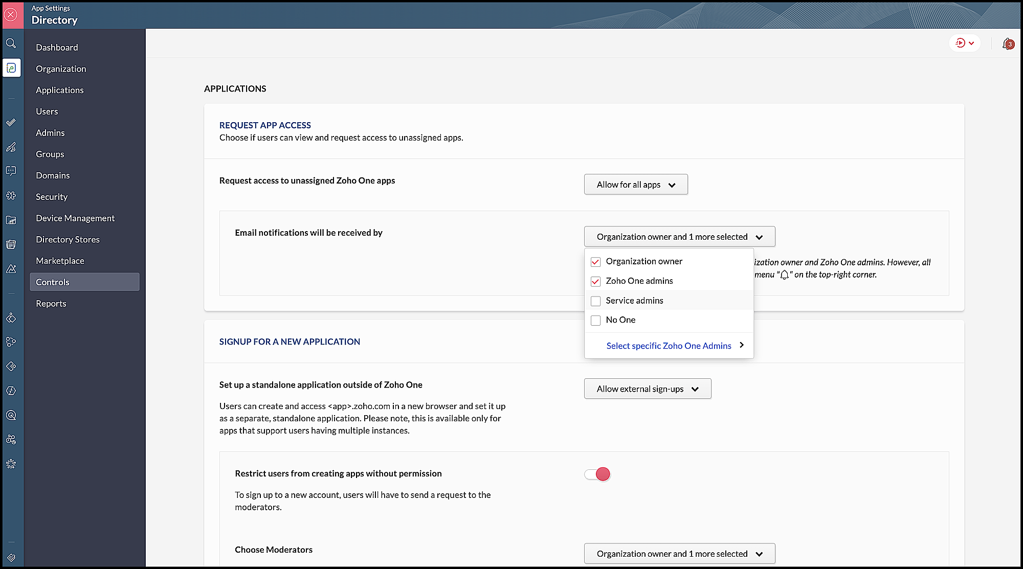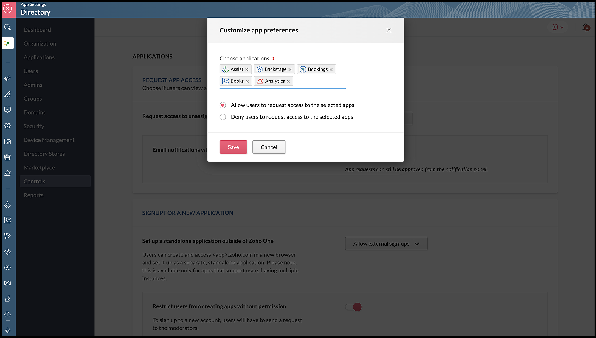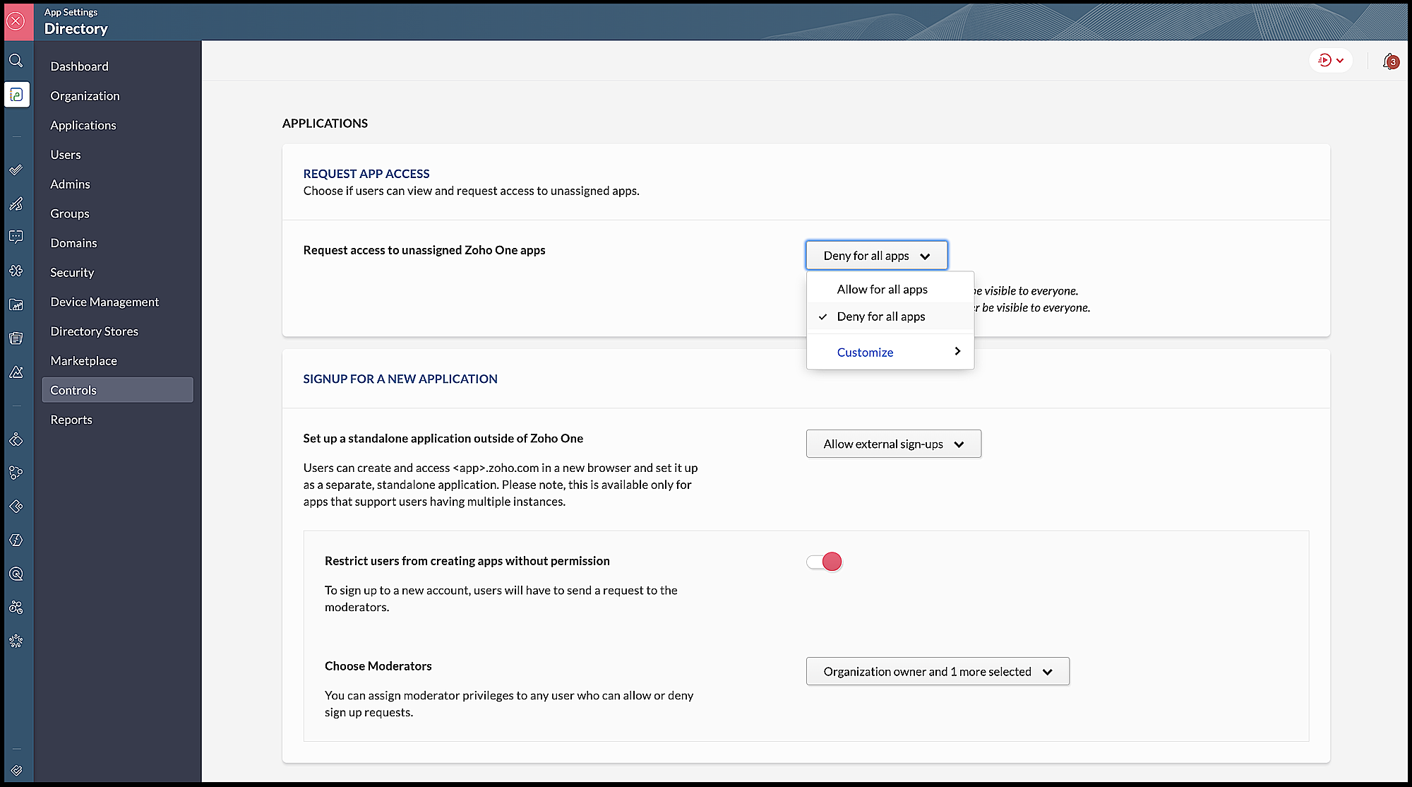 Prohibir a los usuarios crear instancias independientes de una aplicación de Zoho One