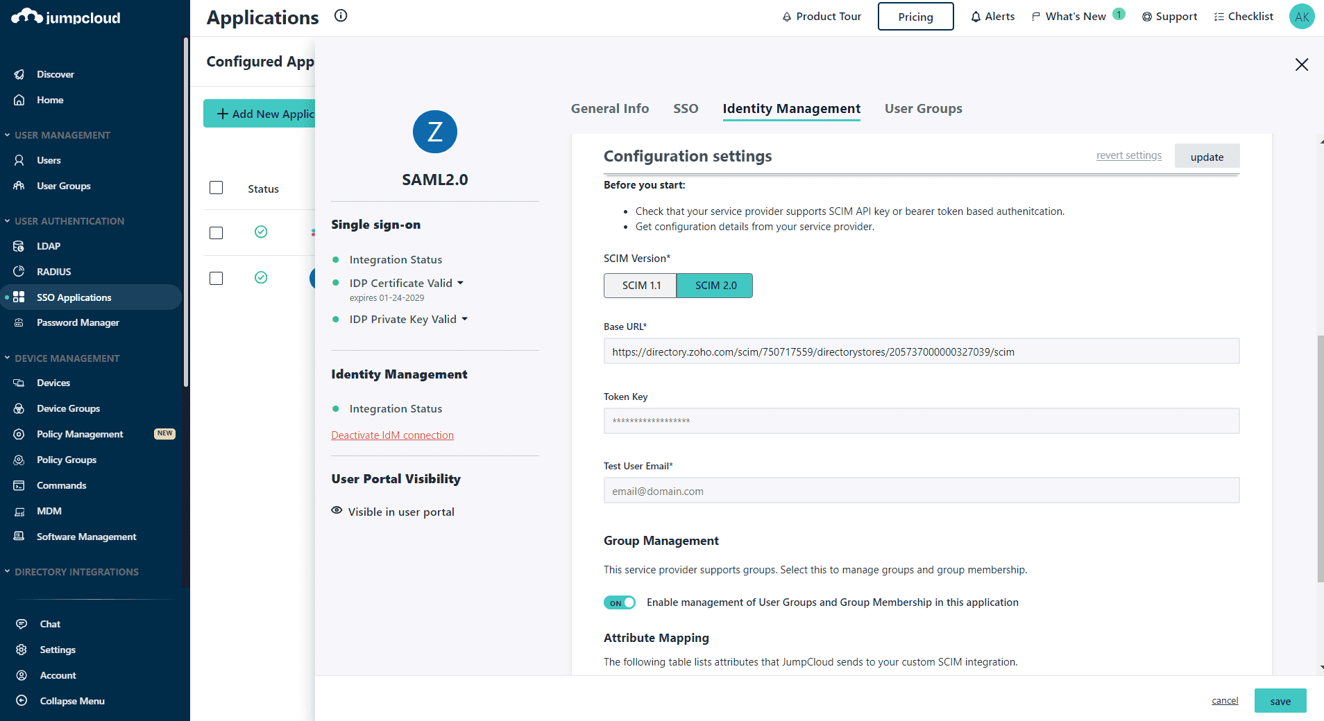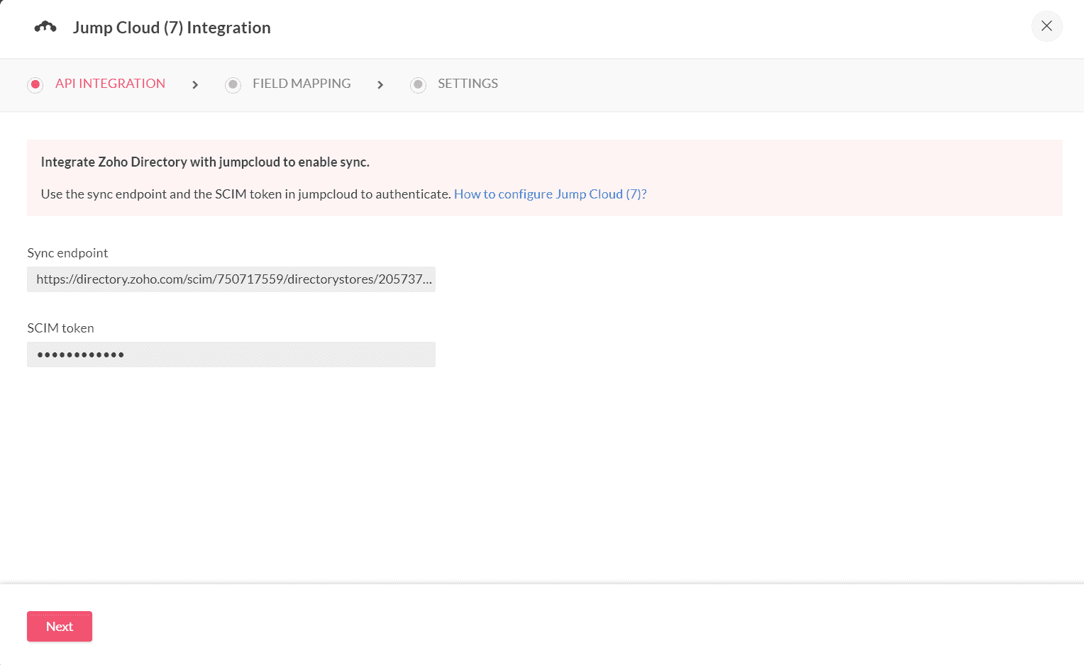 Bajo INTEGRACIÓN API, anota el punto de sincronización y el token SCIM. Más tarde, necesitarás proporcionar esta información en JumpCloud para habilitar la sincronización.