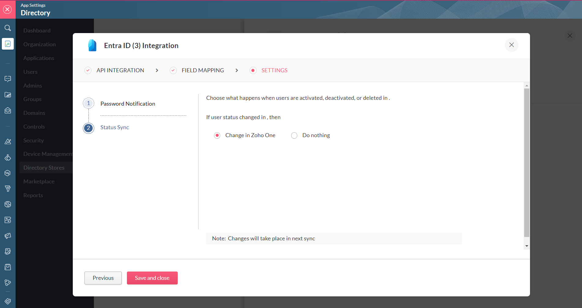 - Elige cómo se debe reflejar el cambio en el estado del usuario en Entra ID en Zoho One.