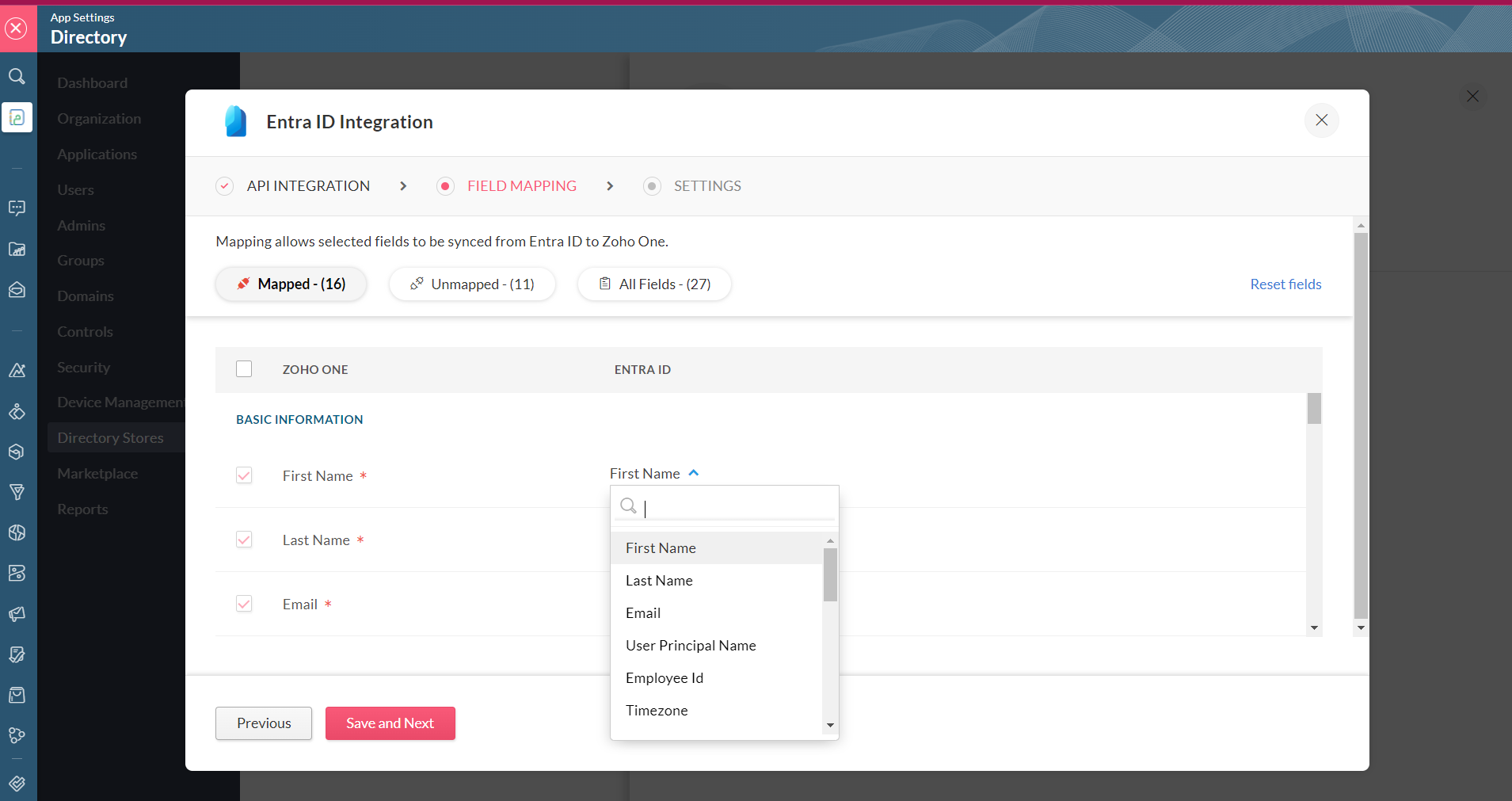 Bajo MAPEO DE ATRIBUTOS, mapea los campos disponibles en Zoho One a los campos disponibles en Entra ID.