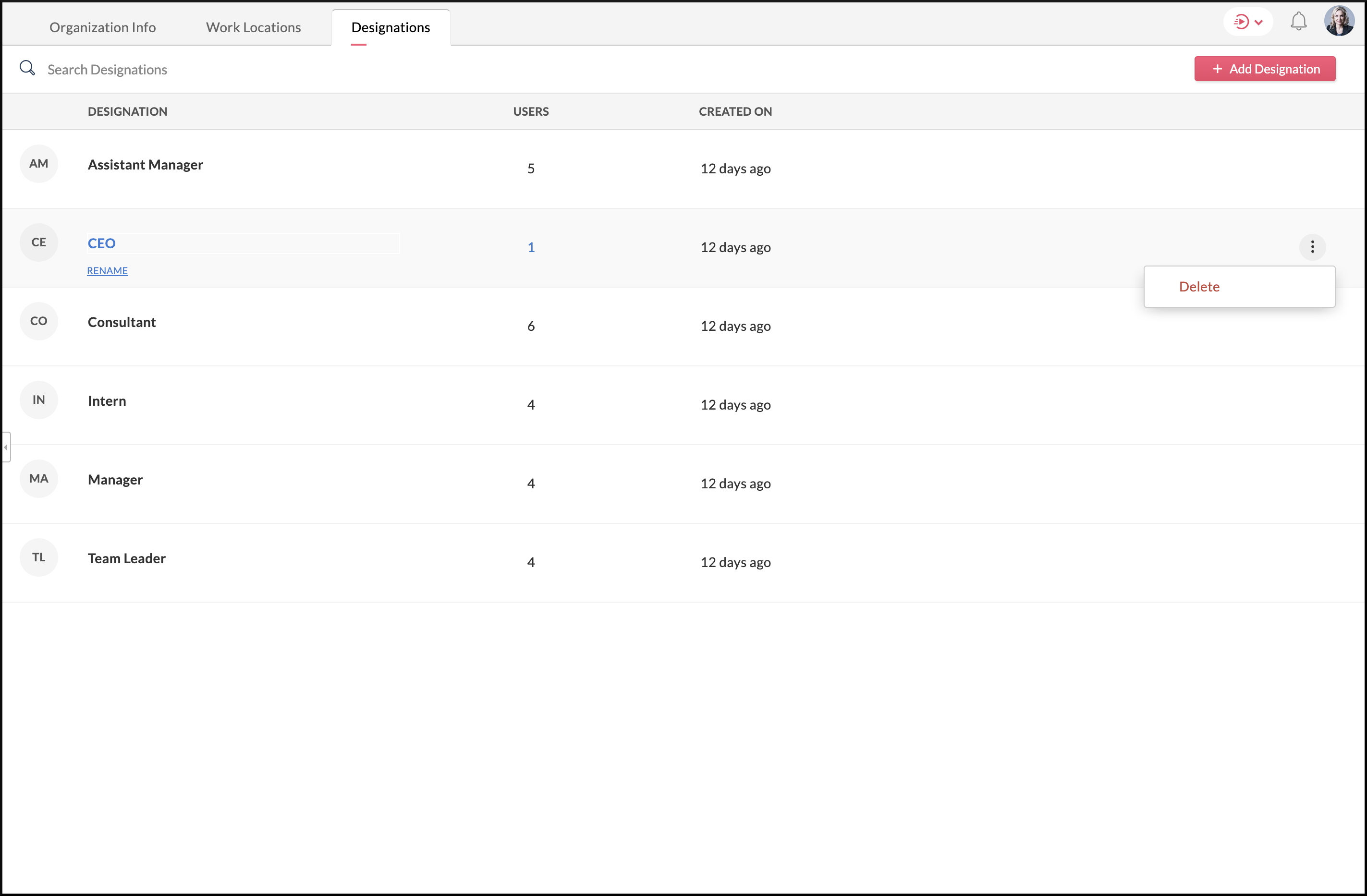 Inicia sesión en Zoho One , luego haz clic en Directorio en el menú de navegación a la izquierda. Ve a Organización, luego haz clic en Designaciones. Pasa el cursor sobre la designación que deseas renombrar. Haz clic en Renombrar, cambia el nombre, ...