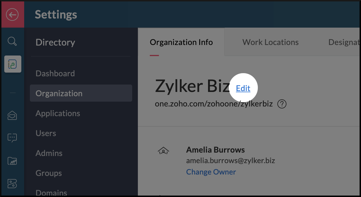 Nota: Solo el propietario de la organización puede editar la información de la organización. Inicia sesión en Zoho One , luego haz clic en Directorio en el menú de navegación a la izquierda. Ve a Organización, luego haz clic en Editar Logo y Favicon ...