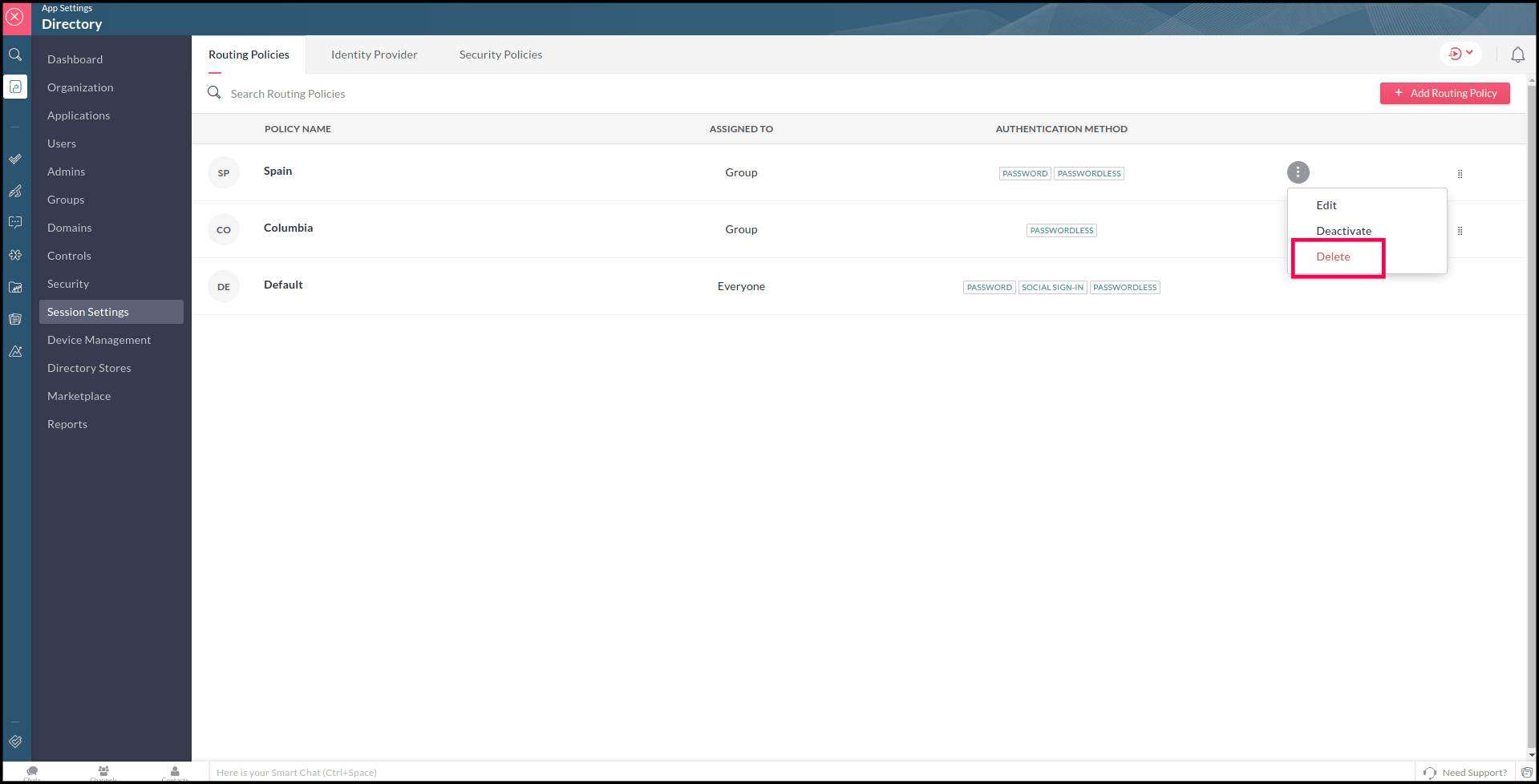 Requisitos previos Roles requeridos para realizar esta acción: Propietario de la organización Administrador de la organización Para desactivar una política de enrutamiento: Inicia sesión en Zoho One. Haz clic en Directorio en el menú de la izquierda. ...