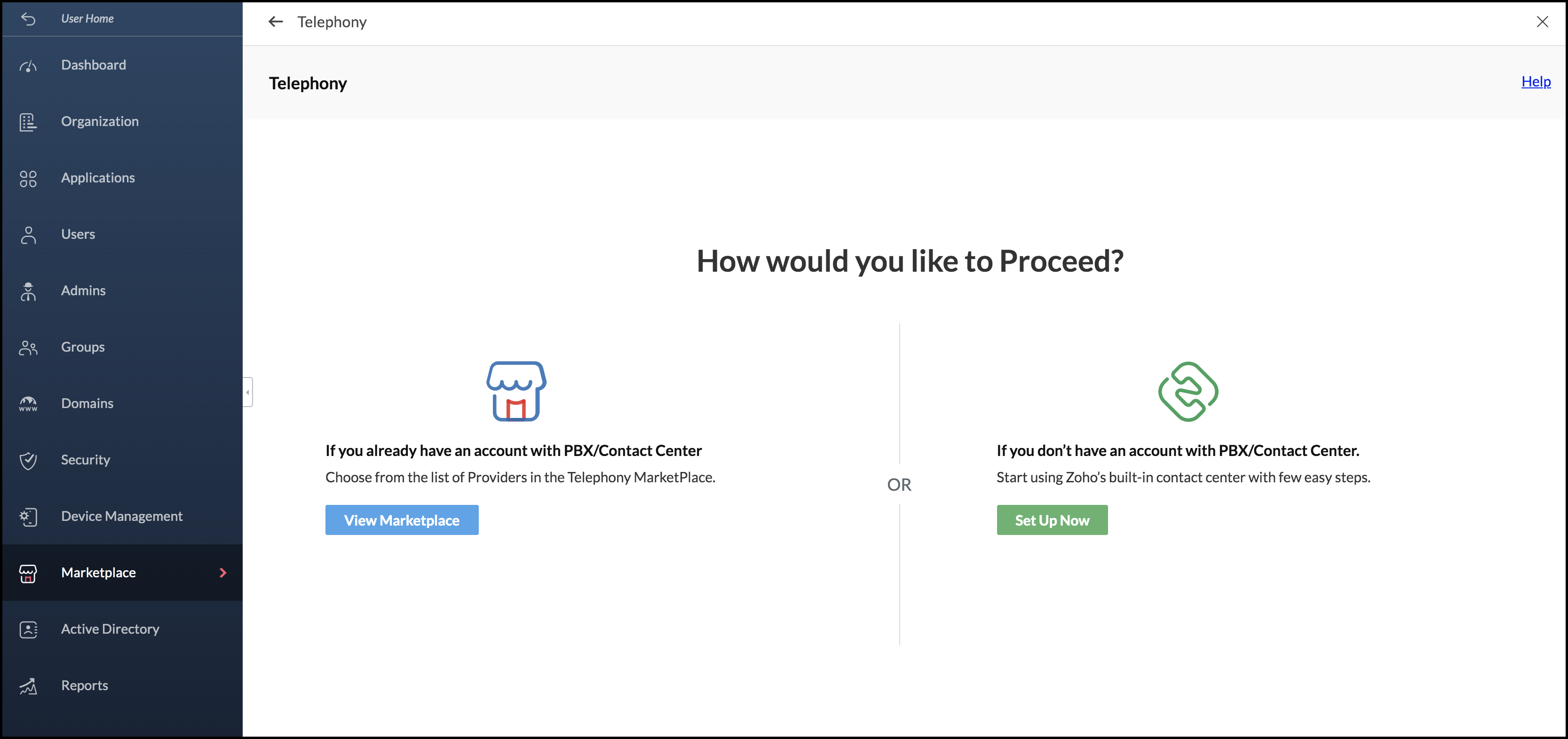 Pide al administrador de tu organización en Zoho One que habilite PhoneBridge en el panel de administración de Zoho One, luego intenta de nuevo.