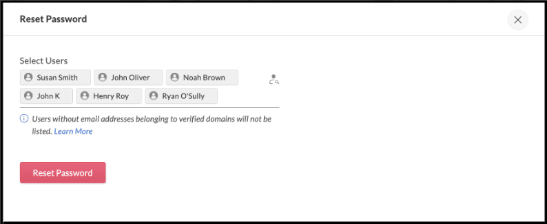- Si intentas restablecer la contraseña de un usuario con un dominio no verificado, se te pedirá que verifiques su dominio. Al restablecer contraseñas para múltiples usuarios, los usuarios con dominios no verificados serán omitidos de la lista.