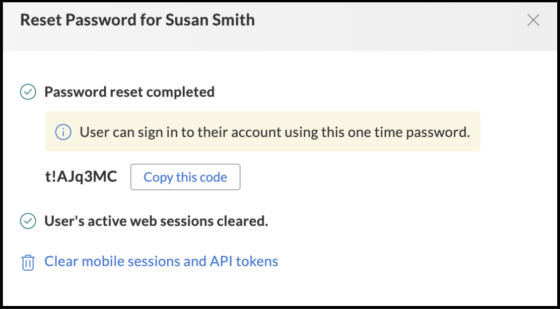 - Haz clic en Limpiar sesiones móviles y tokens de API, si deseas limpiar las sesiones móviles de los usuarios y forzarlos a iniciar sesión con su nueva contraseña.