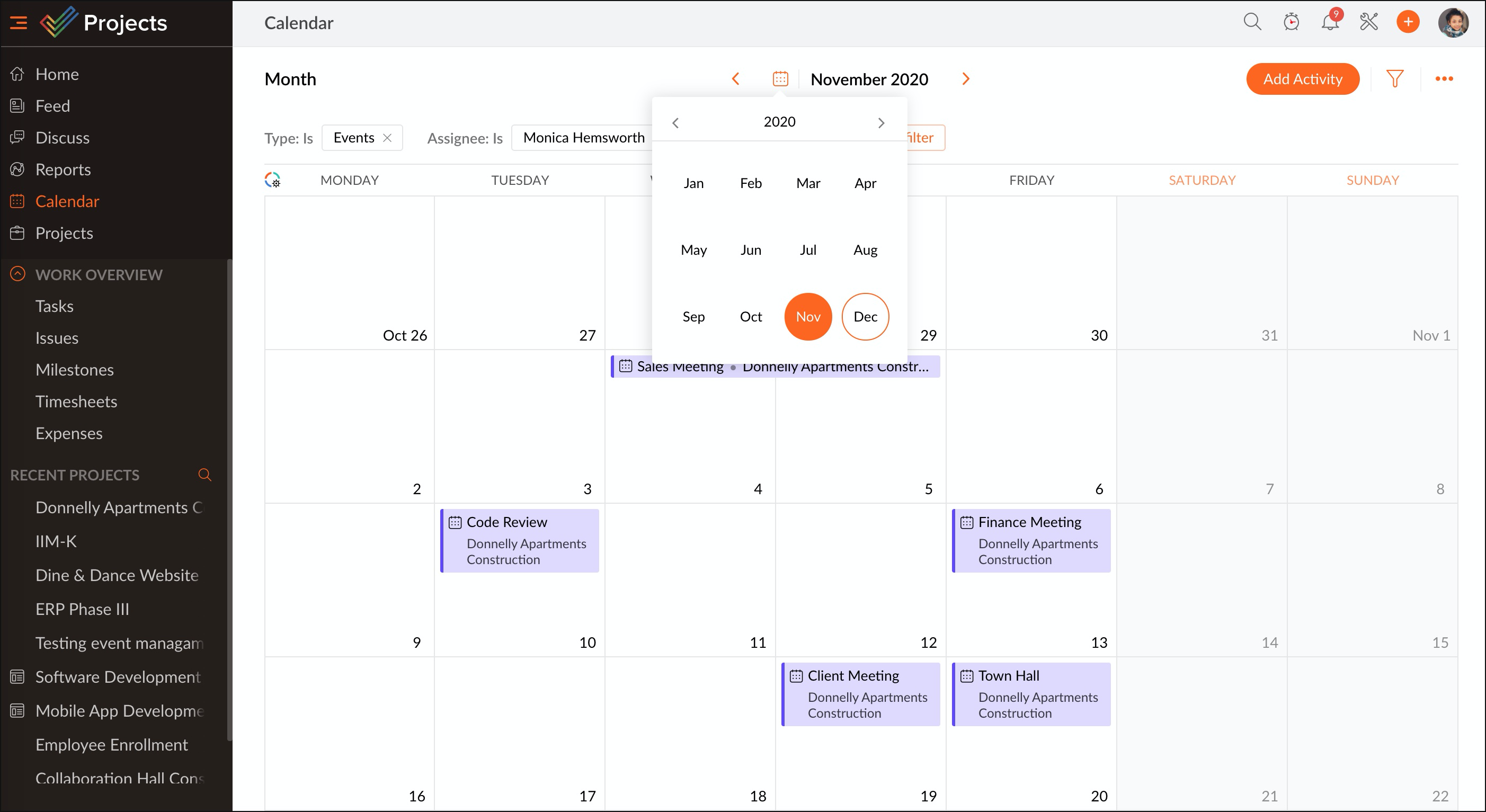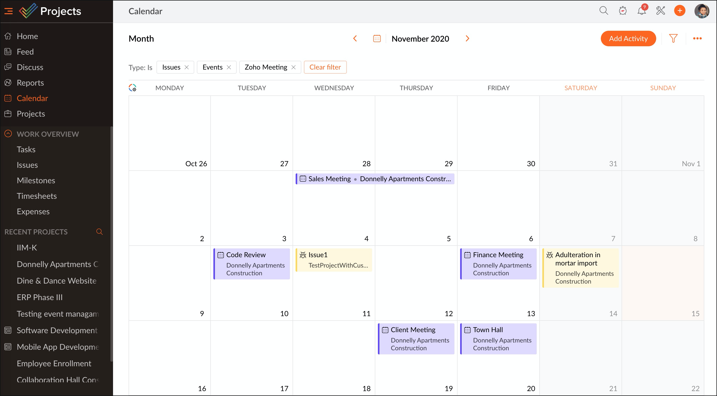 Gestione las fechas límite del proyecto y las entregas clave con sus módulos de calendario. Puede crear hitos, tareas, días libres (requiere que Zoho People esté integrado), eventos y temas dentro del calendario. También puede ver todas las actividades del proyecto programadas para fechas específicas en su calendario.