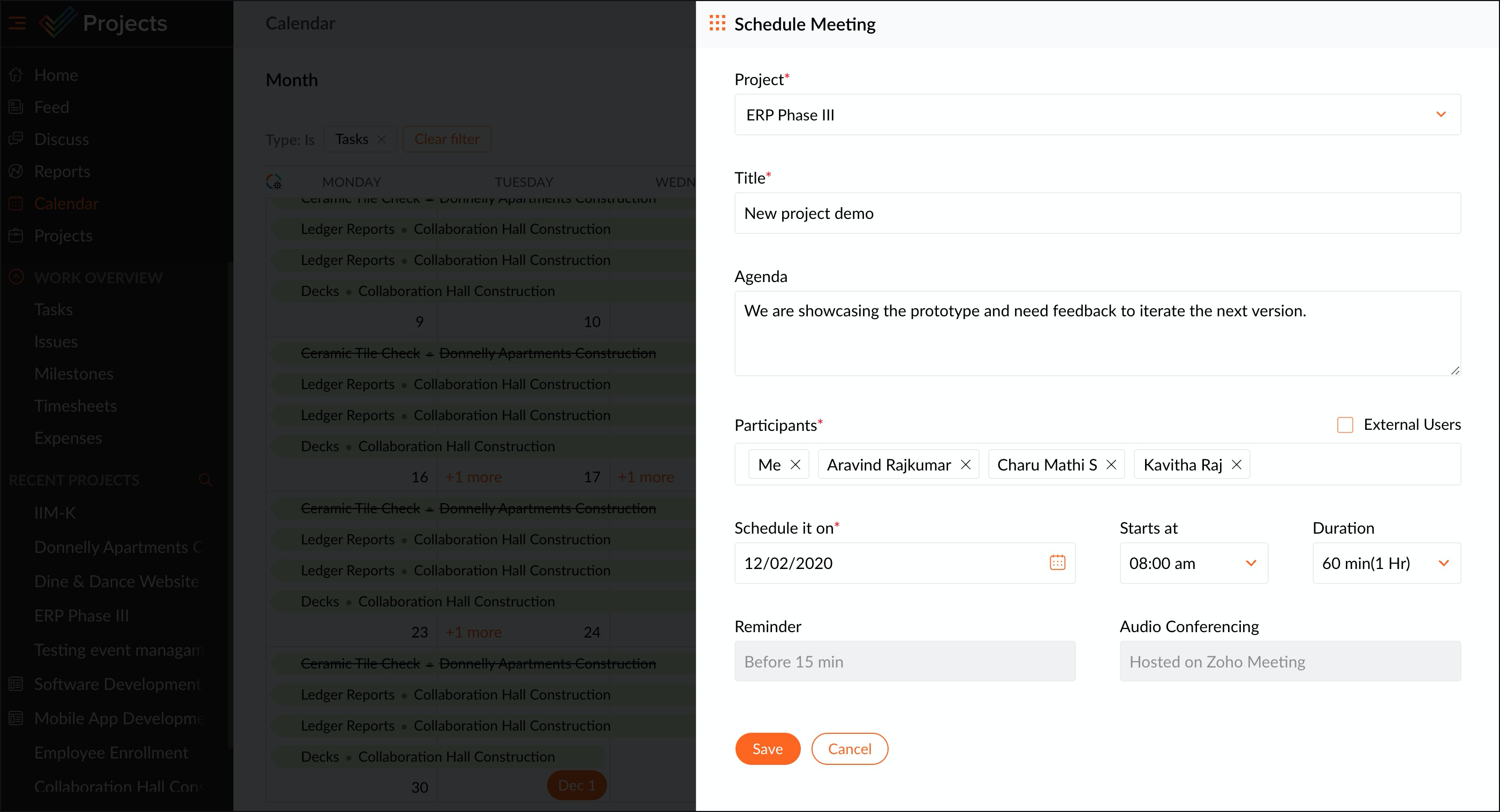El módulo Calendario en Zoho Projects admite filtros para ver los datos según el usuario asignado o el tipo, o ambos. Seleccione los criterios del filtro para ver los datos coincidentes. Calendario basado en el usuario y en el tipo Haga clic en la ...