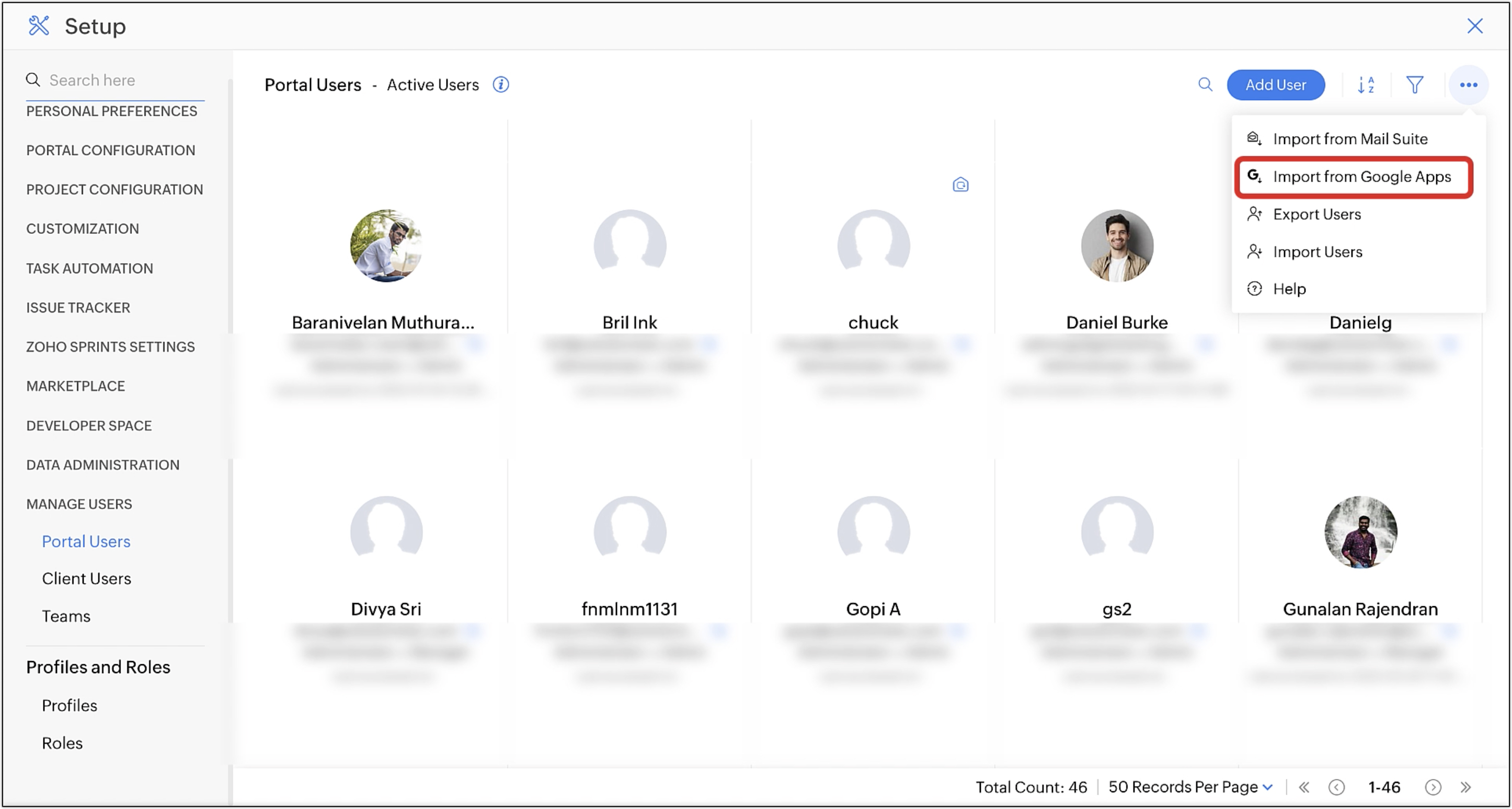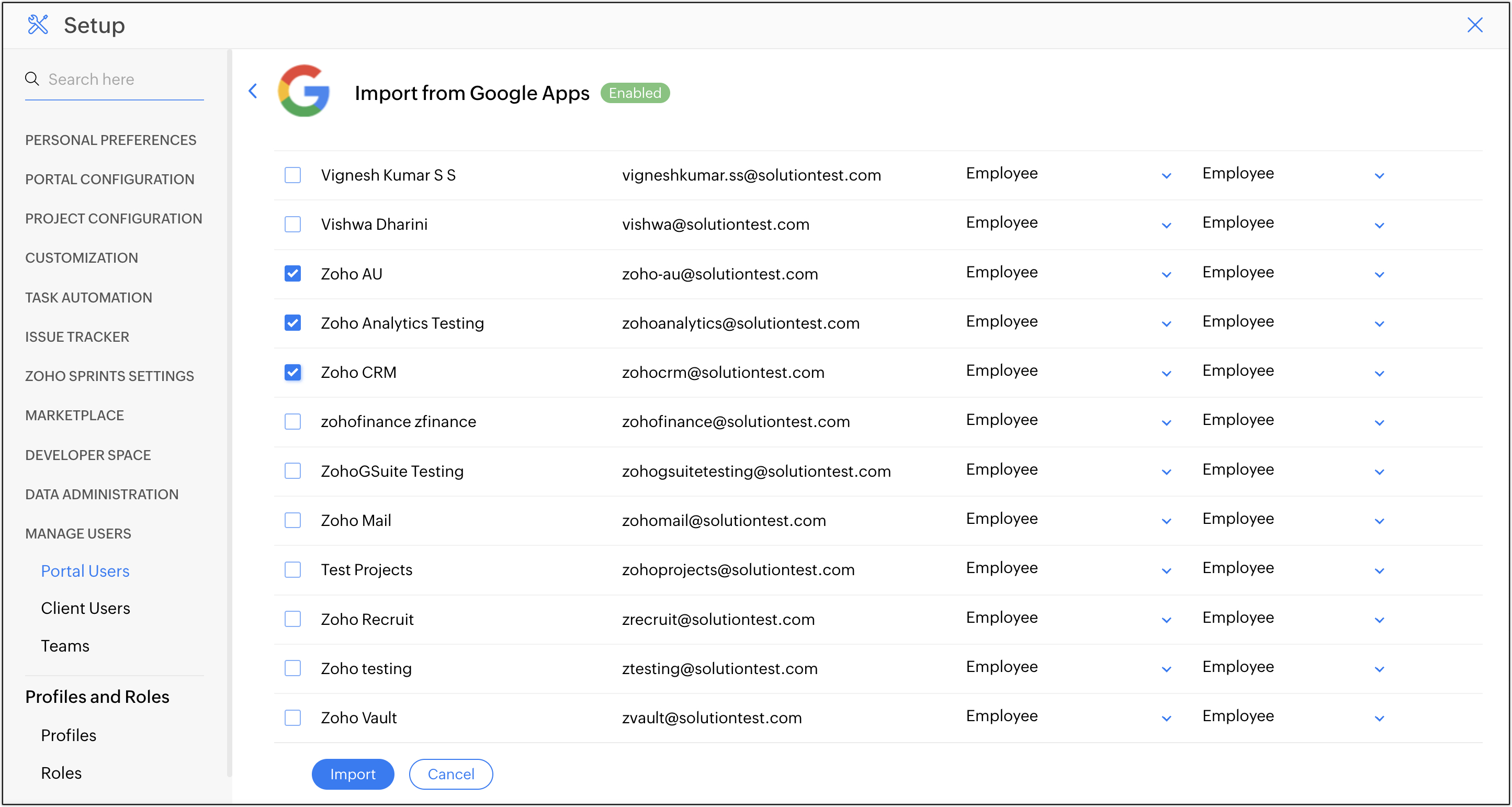 Puede importar fácilmente usuarios de Google Apps a Zoho Projects. Puede importar usuarios de un portal o de cualquier proyecto seleccionado. Sin embargo, puede importar usuarios de Google Apps a Zoho Projects solo si integró su cuenta de Google Apps a Zoho Projects. Esta función no está disponible para los usuarios de Zoho CRM Plus y Zoho One.