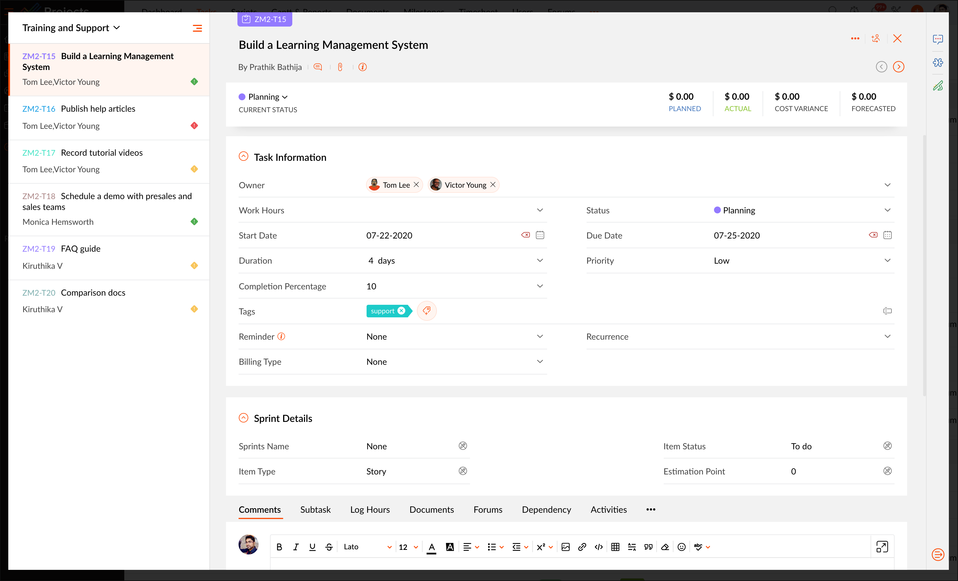 Puede verificar los detalles del sprint en la página de detalles de la tarea en Zoho Projects.