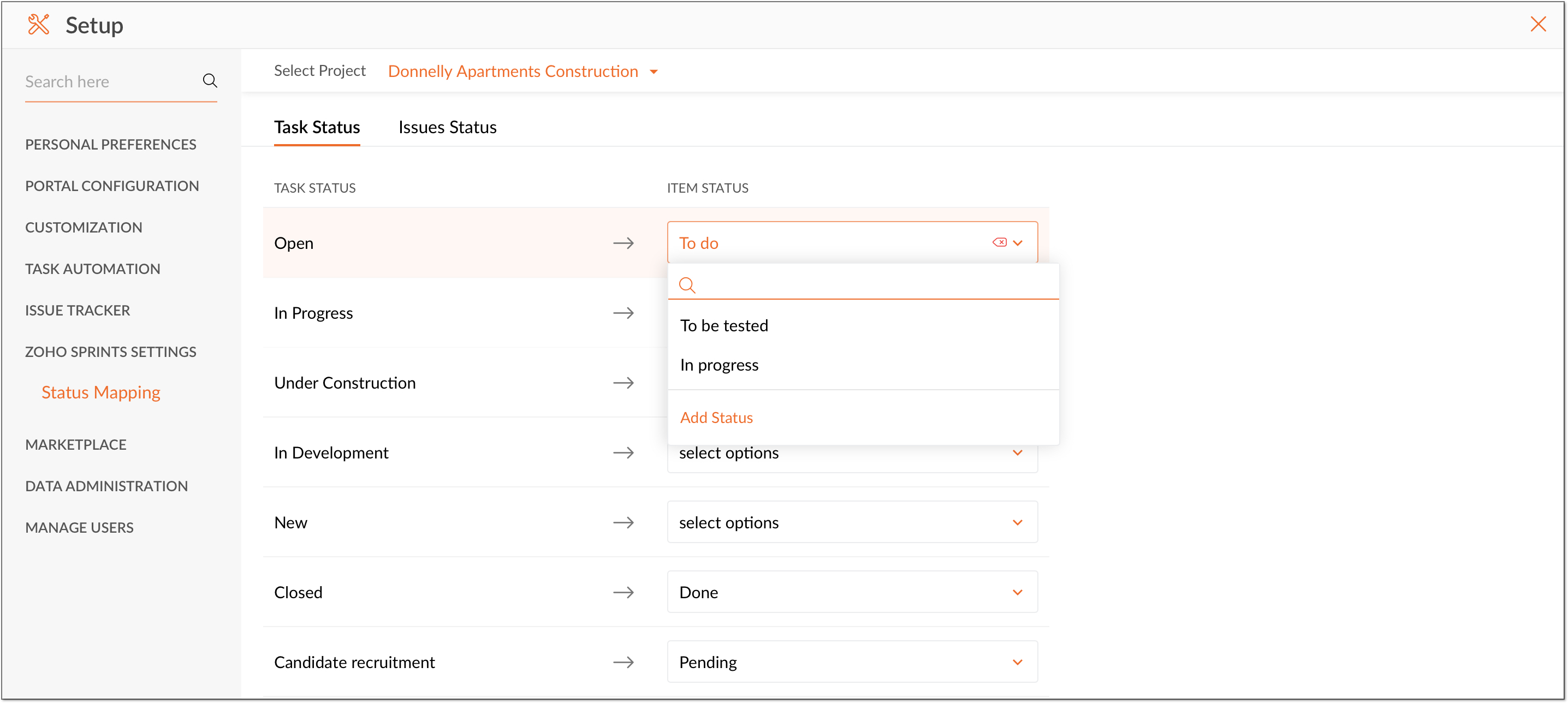 Sincronice el estado de la tarea o el problema con Zoho Sprints