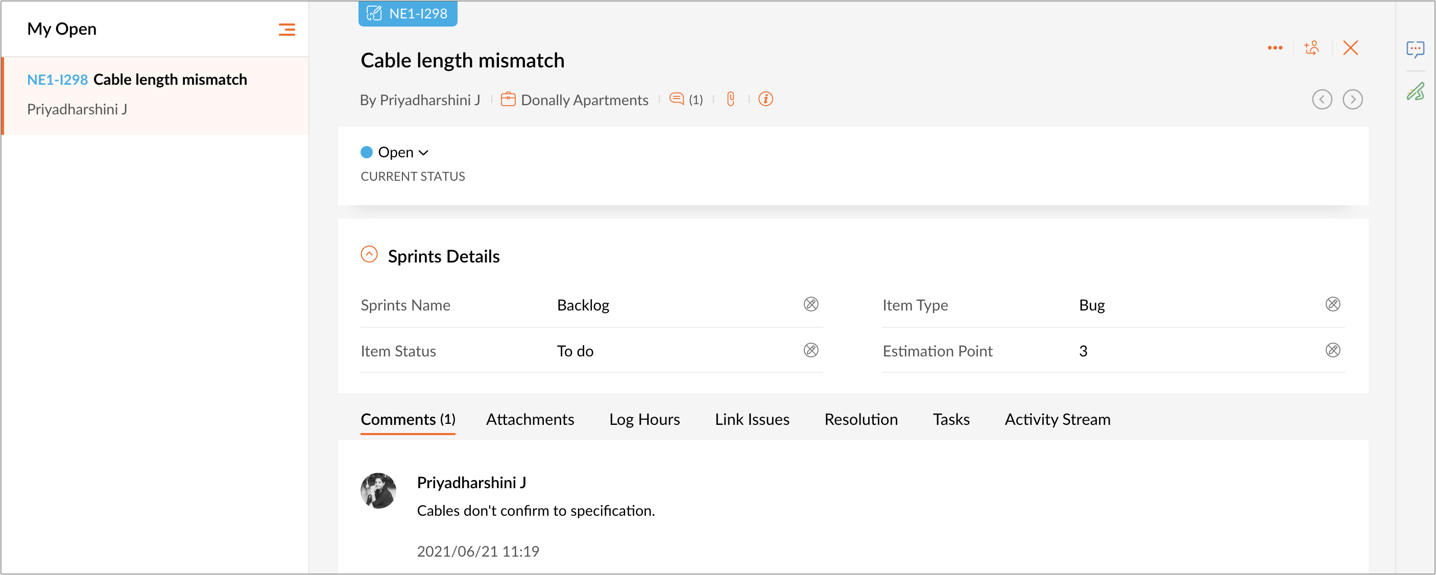 Vaya a la página de detalles del problema y haga clic en el ícono de sprints para ver el problema. Haga clic en el elemento de trabajo para ver los detalles del elemento en Zoho Sprints.