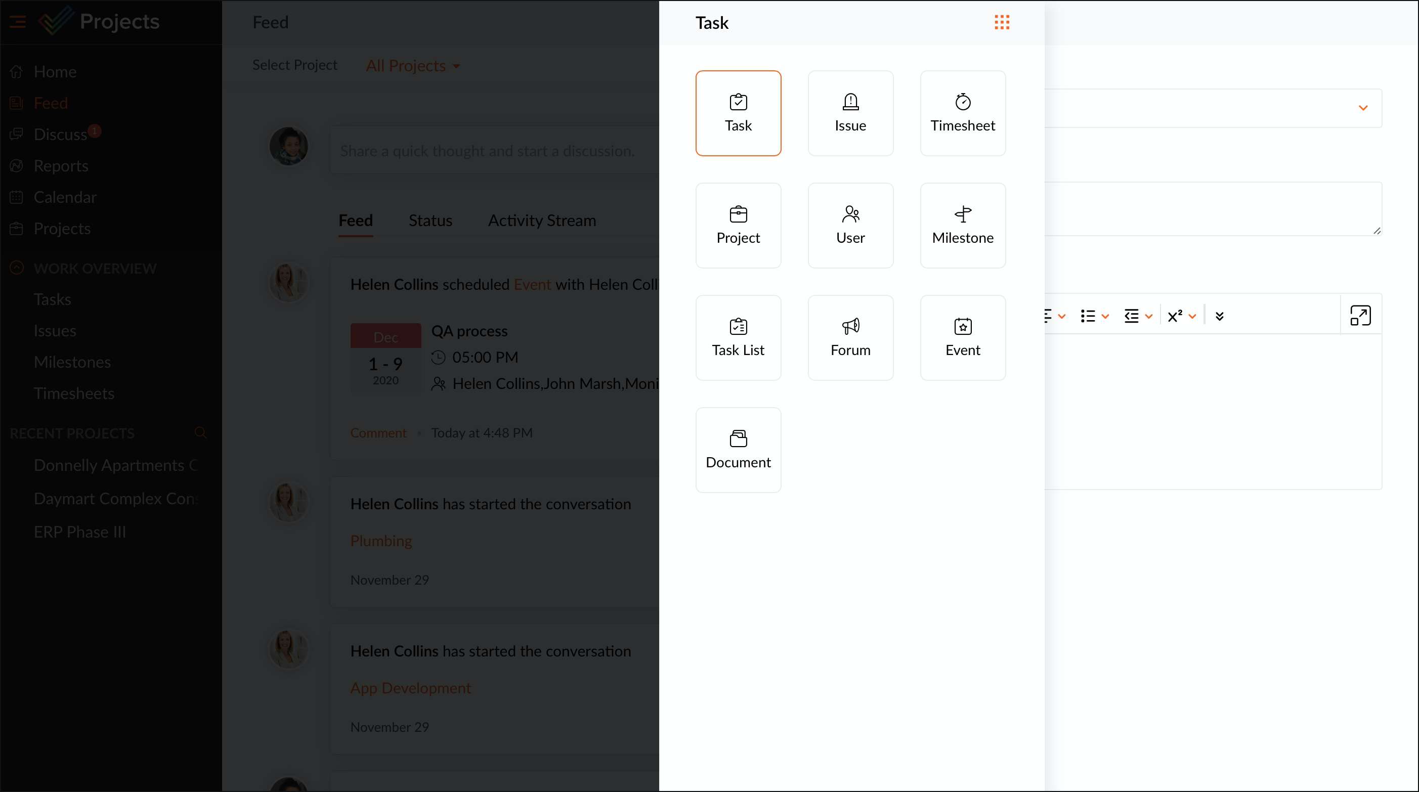 Agregar de forma global facilita la incorporación de tareas, listas de tareas, temas, hitos, planillas de horas trabajadas, foros, proyectos y usuarios sin tener que ir hasta sus módulos específicos. Simplemente haga clic en