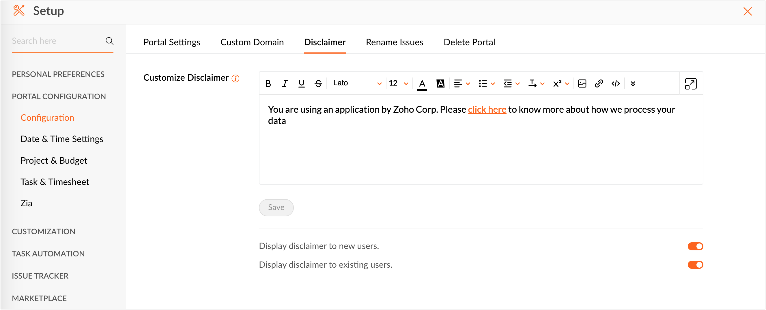 - Vaya a la pestaña Configuración del portal>Configuración>Descargo de responsabilidad.