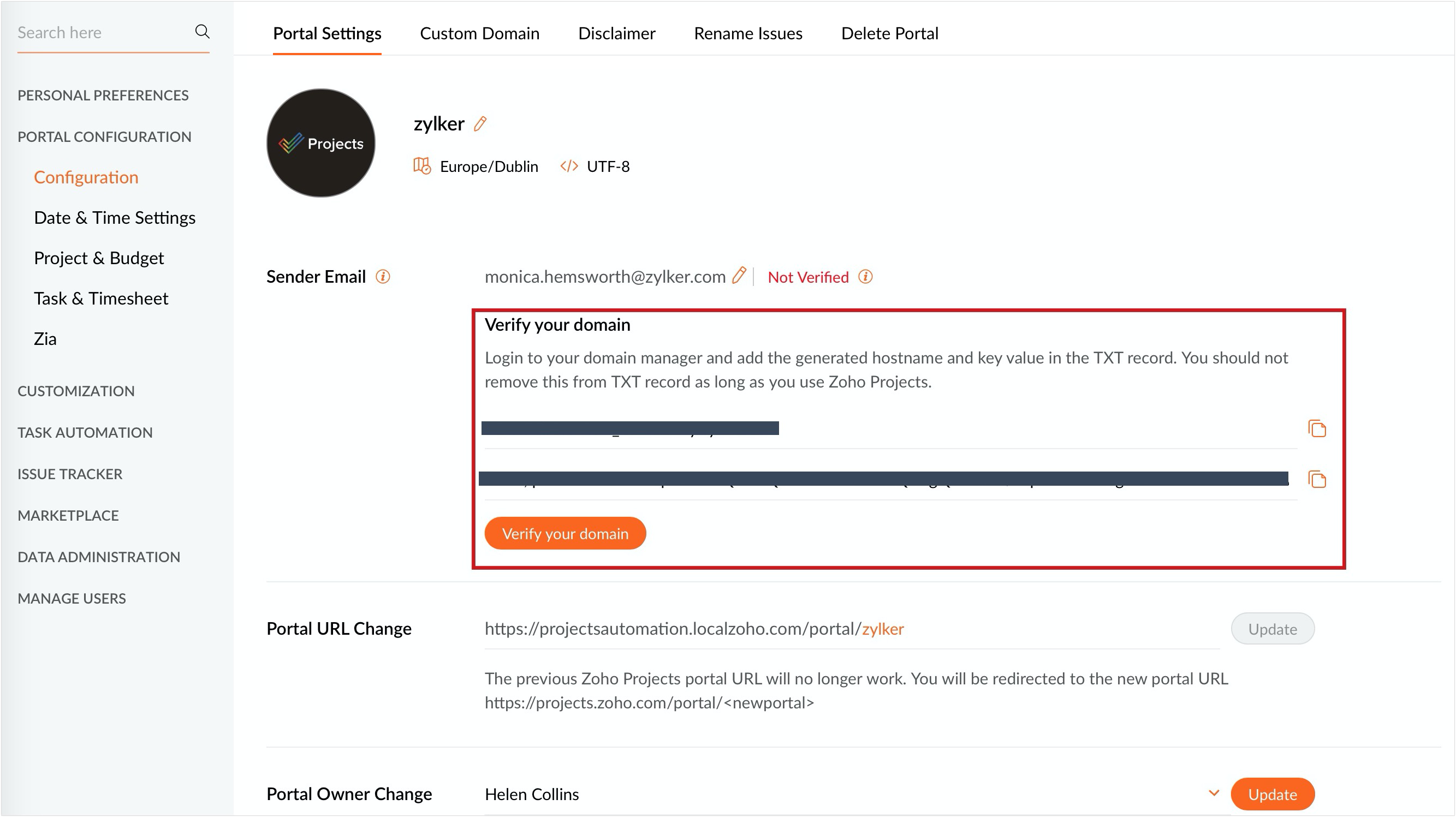 - Haga clic en Verificar dominio en la configuración de correo electrónico del remitente en Configuración del portal.
