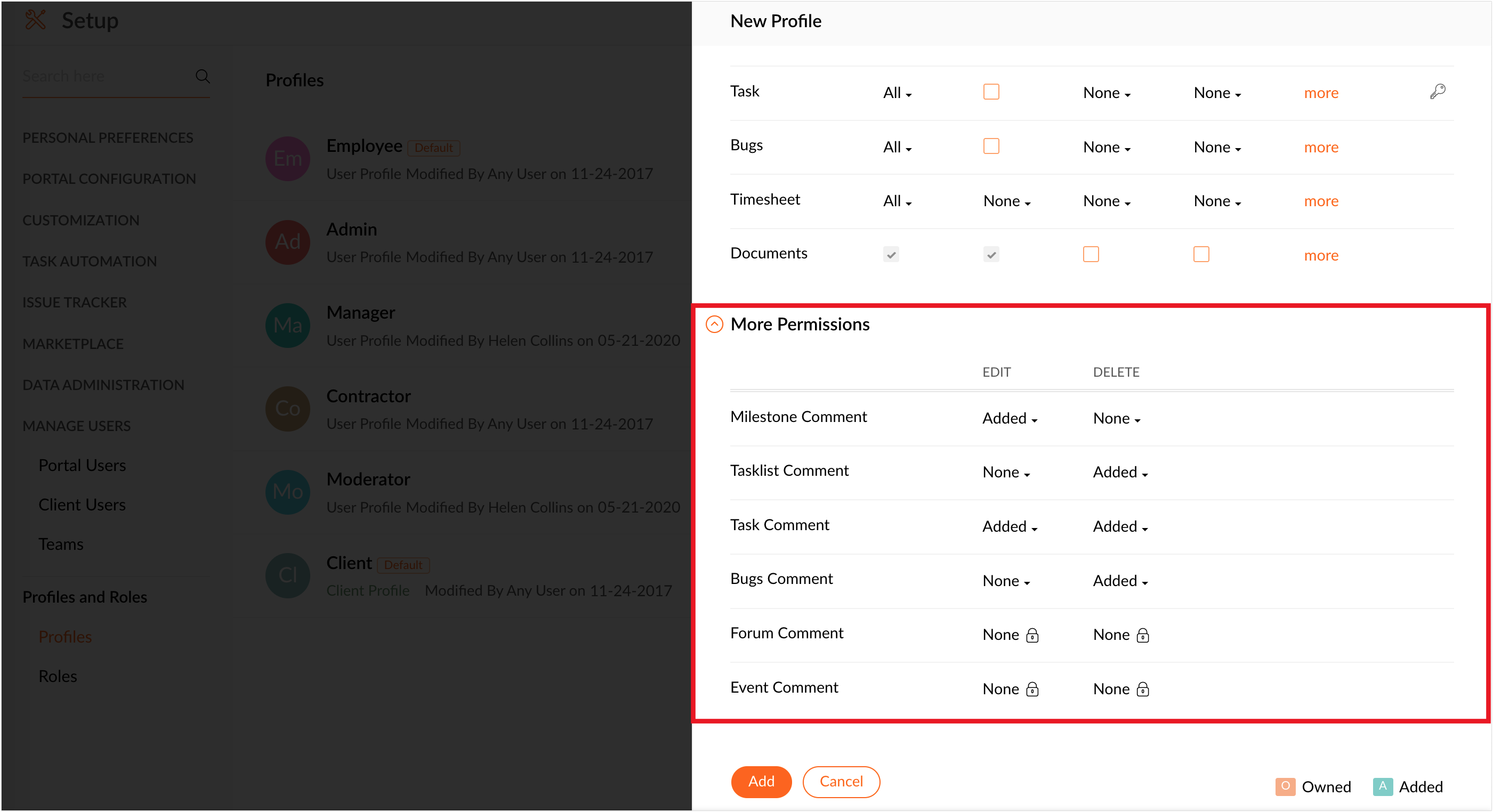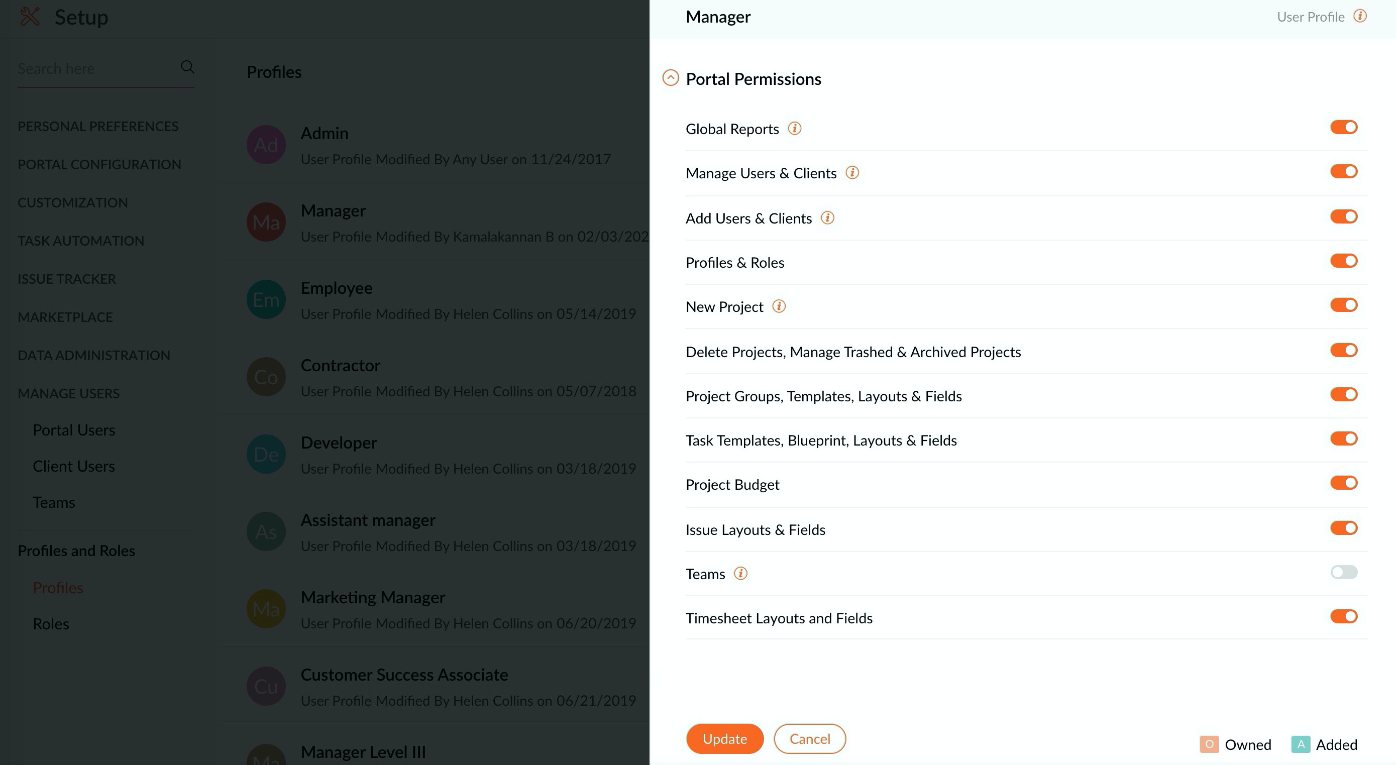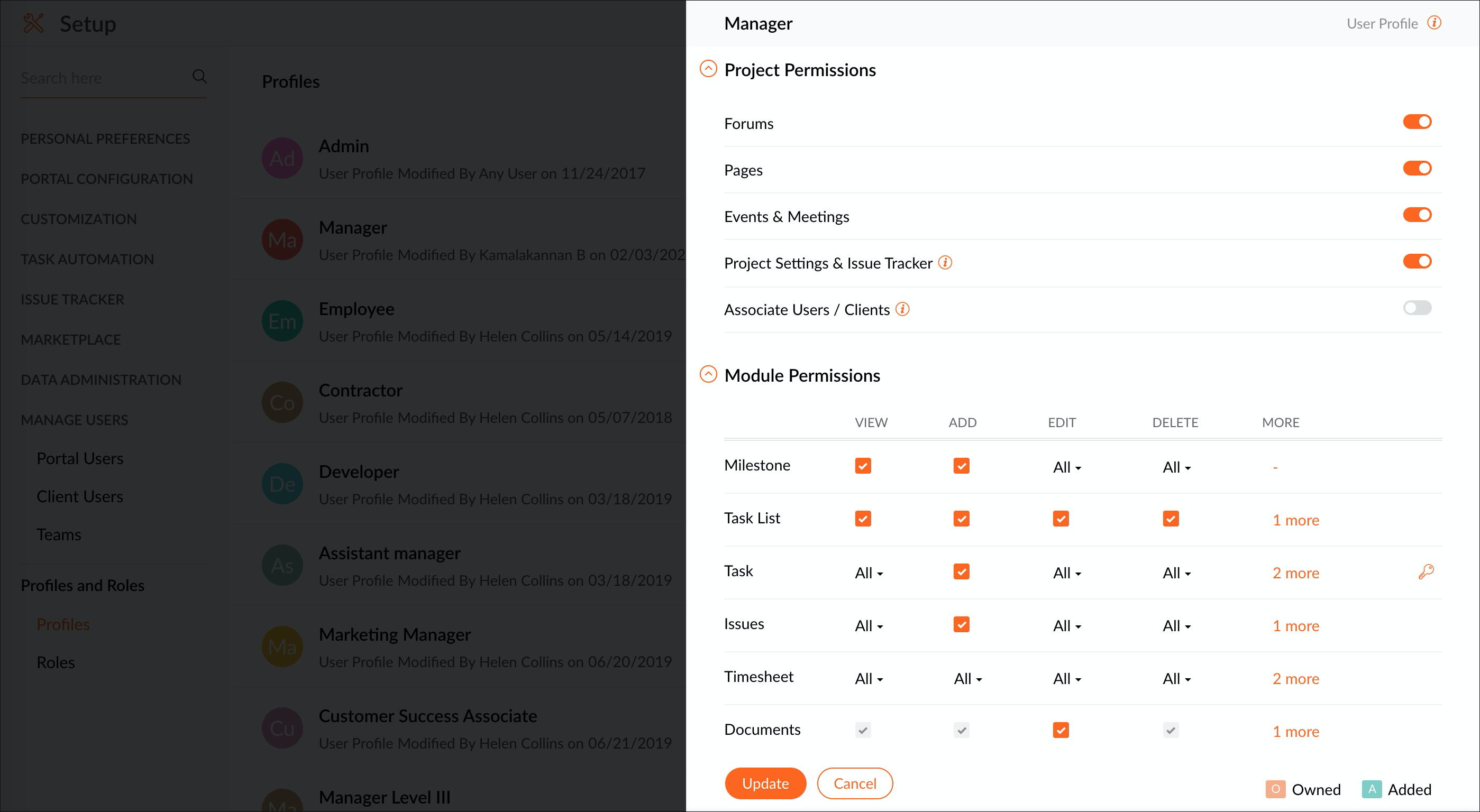 Ver, agregar, editar y eliminar usuarios del portal y clientes (excepto administradores); seguir a los usuarios del portal. Importar usuarios desde Zoho CRM, Zoho Mail Suite, MS Projects y Google Apps. |