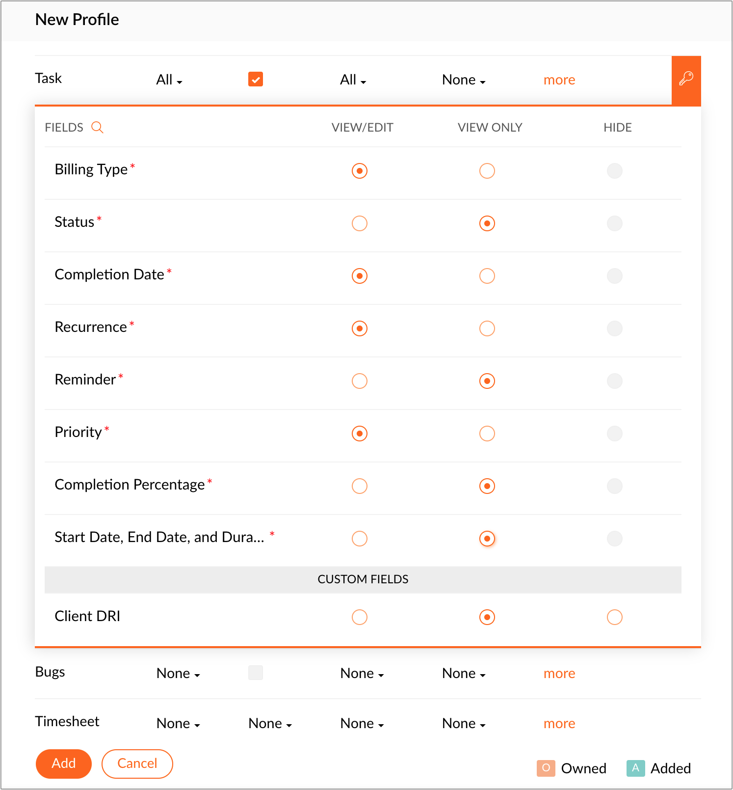 En los permisos de módulo para tareas, haga clic en a fin de personalizar el permiso Asignar tarea y el permiso de acceso de Campo. En el permiso Asignar tarea, hay dos opciones basadas en las cuales el perfil de usuario puede asignar tareas.