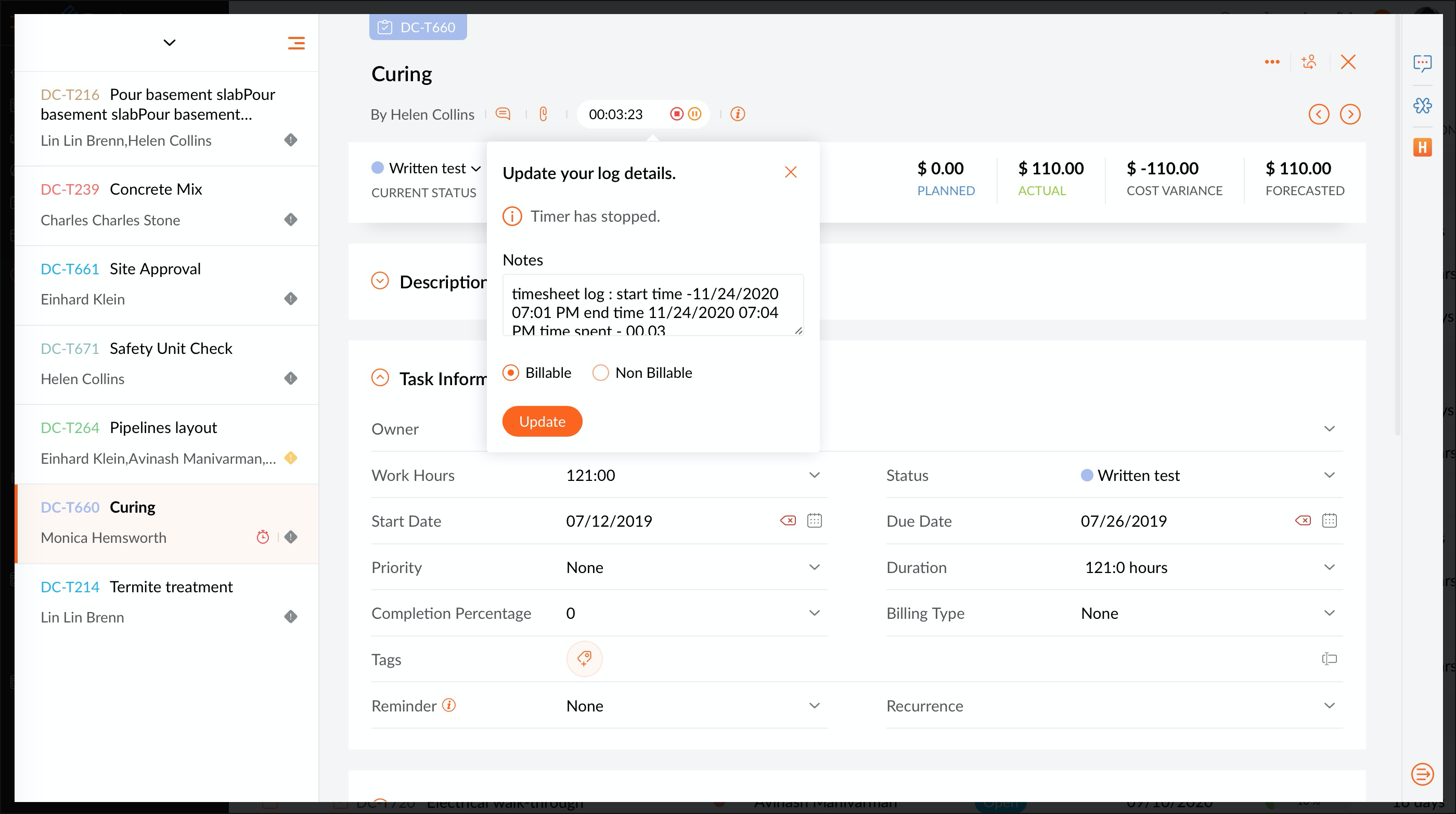 - El tiempo se registra cuando un usuario detiene el temporizador. Ingrese las notas, seleccione si el registro de tiempo es facturable o no facturable y, a continuación, haga clic en Actualizar.