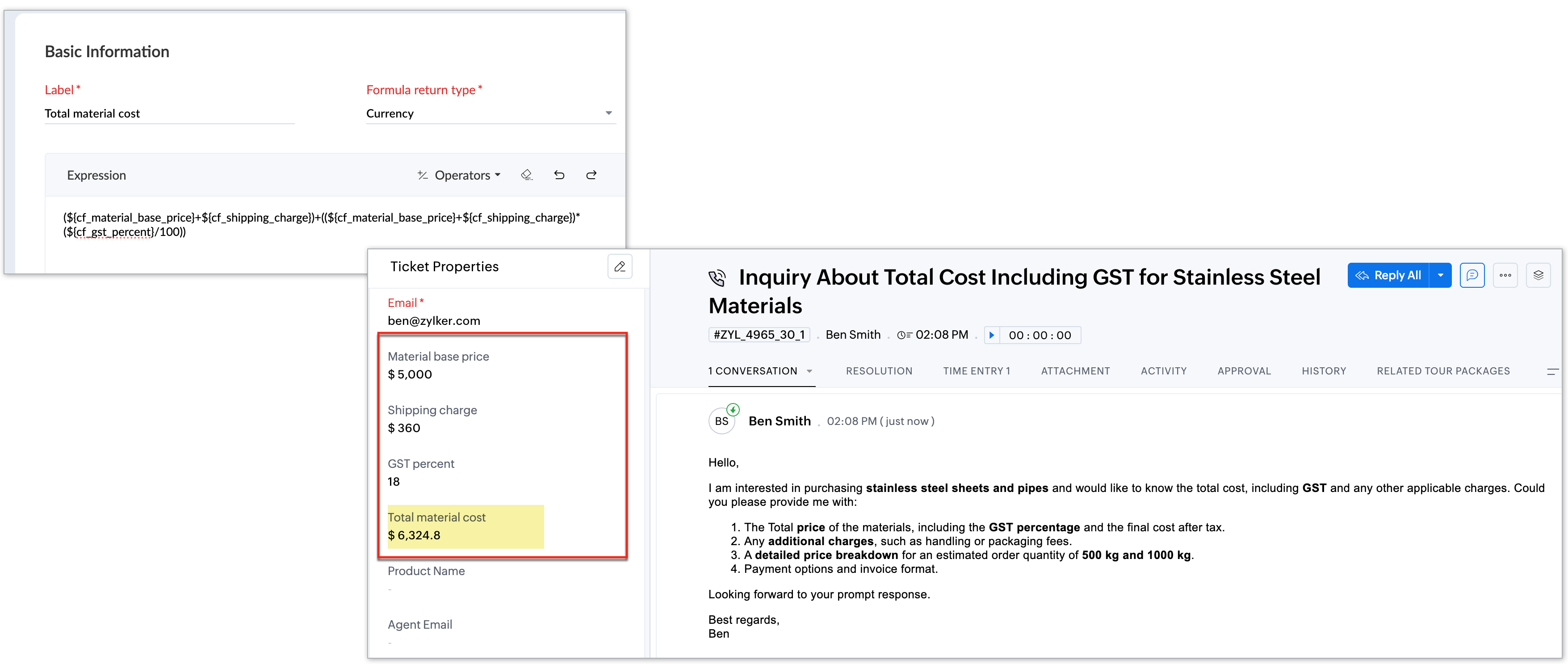 Formula fields update dynamically as ticket data changes, offering managers and agents immediate insights so they can take prompt action.
