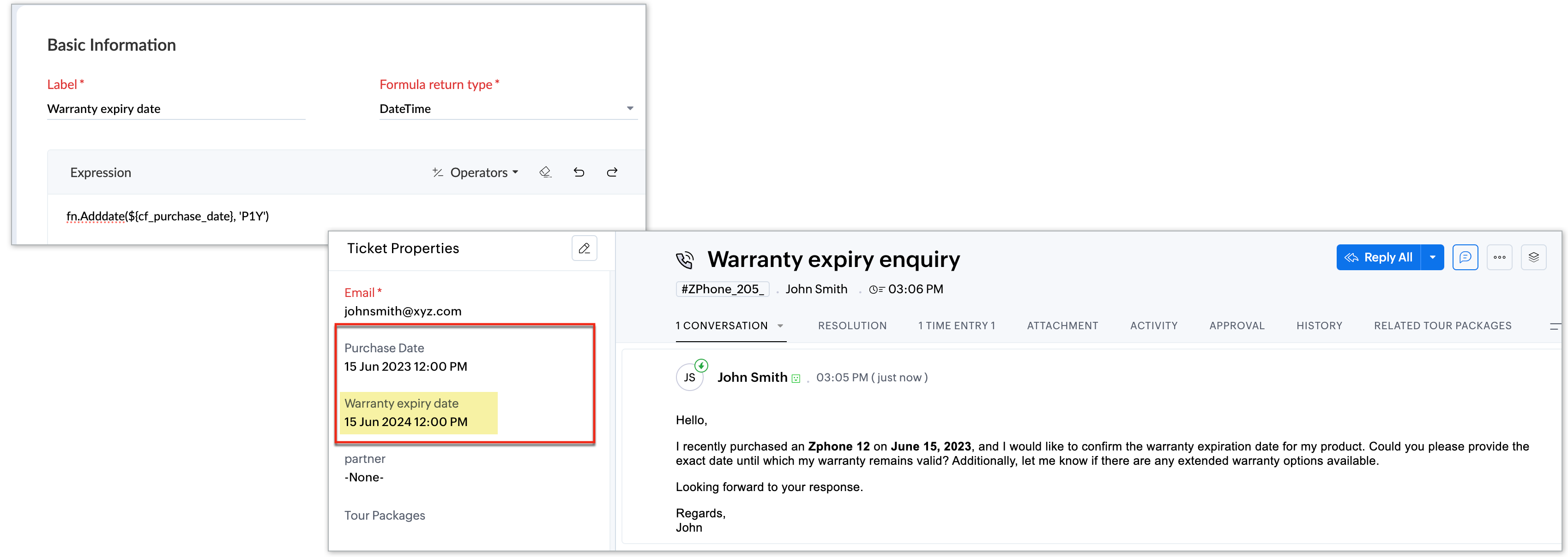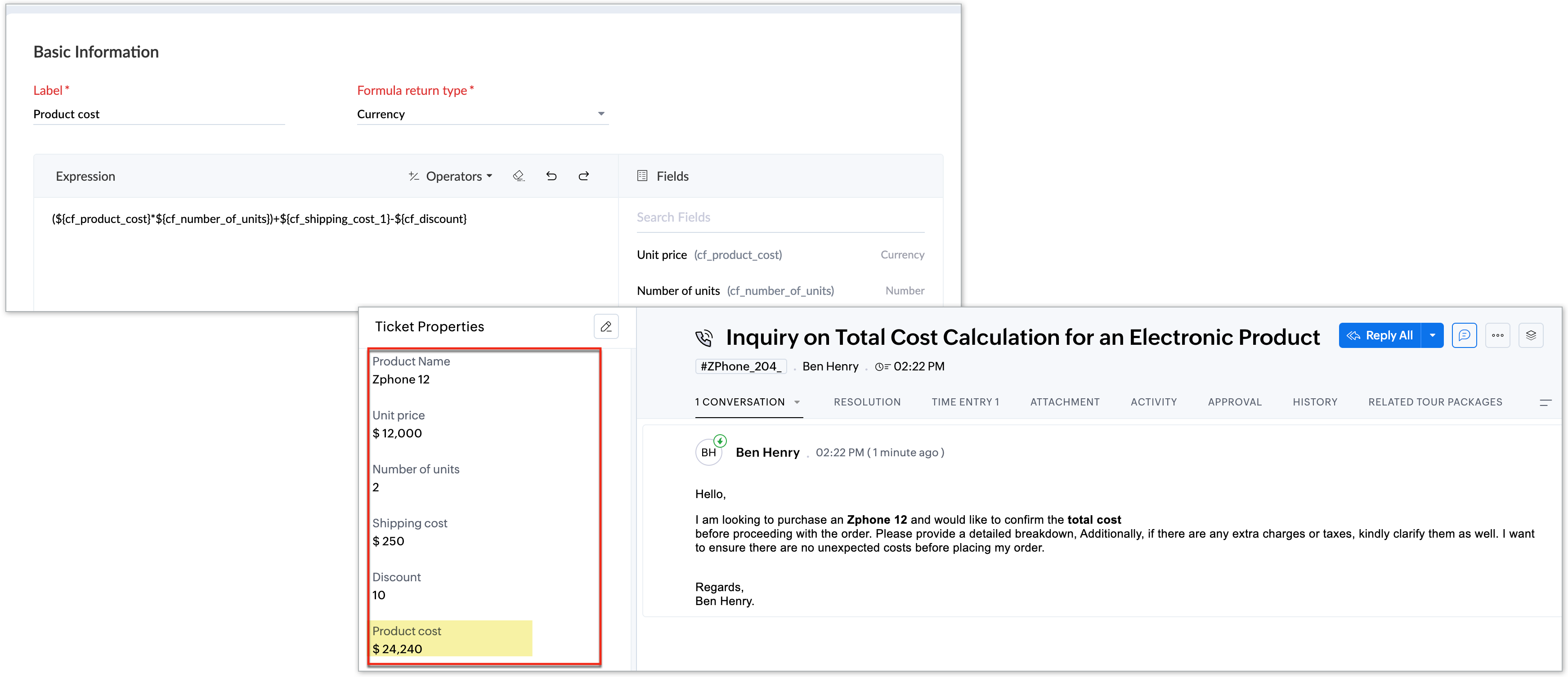 Formula fields are custom fields that allow you to perform calculations by combining functions, operators, and existing Zoho Desk fields. With formula fields, you can create custom equations to automate complex calculations. Formula fields can perform: