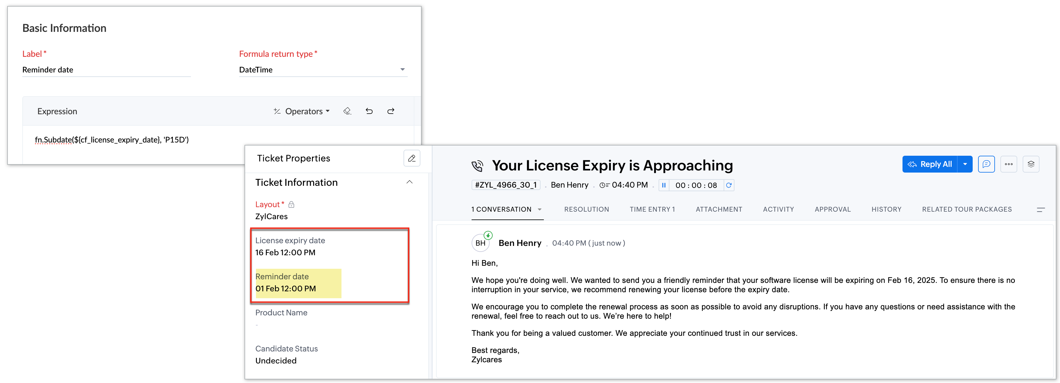 This formula helps to generate a reminder date that is 15 days before the license expiry, ensuring that customers are notified in advance. By using this calculation, businesses can send renewal reminders ahead of time, giving customers ample time to renew their licenses and avoid service interruptions.