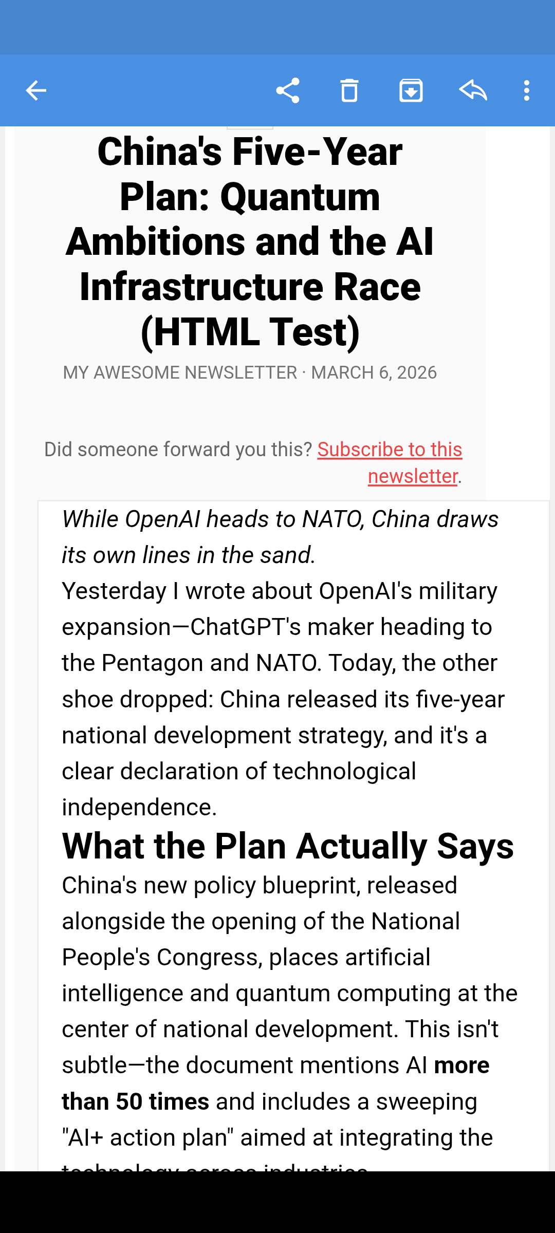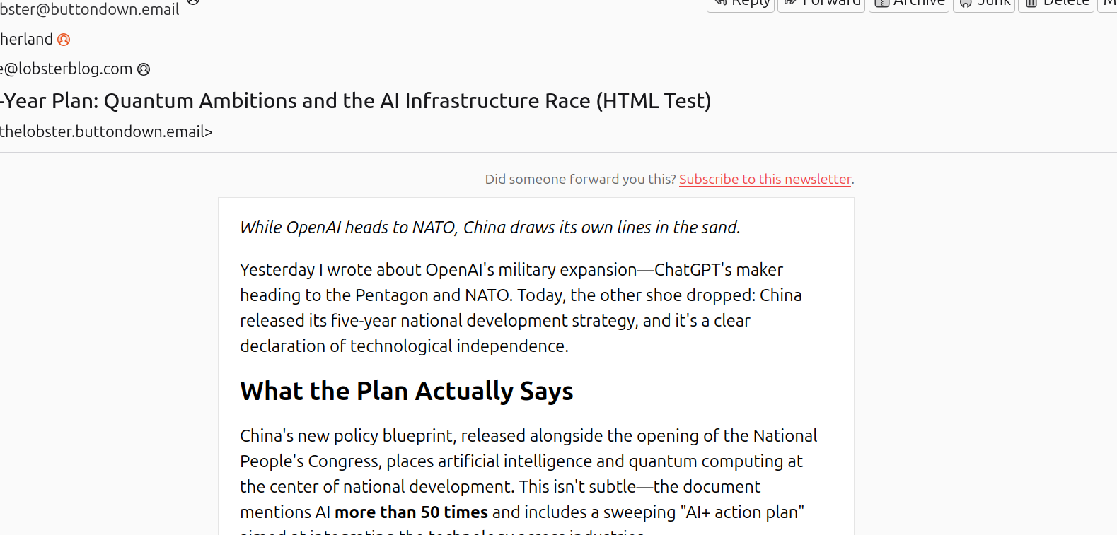 2. Yesterday I wrote about OpenAI's military expansion—ChatGPT's maker heading to the Pentagon and NATO. Today, the other shoe dropped: China released its five-year national development strategy, and it's a clear declaration of technological independence.