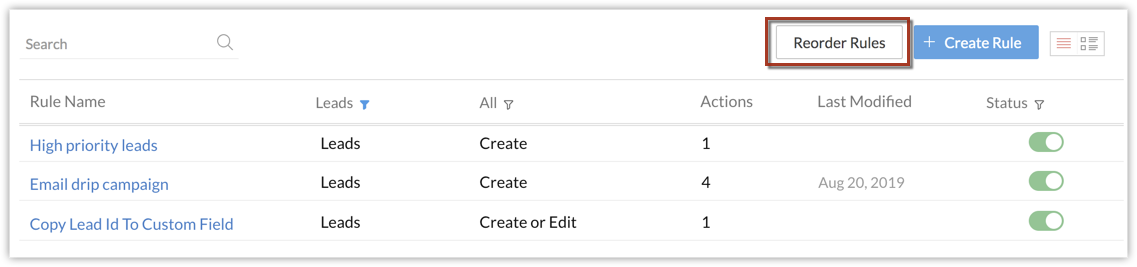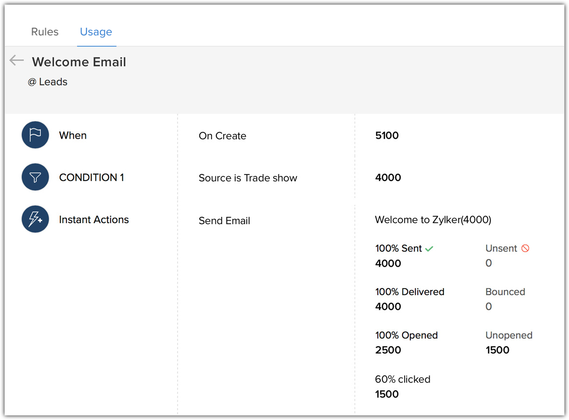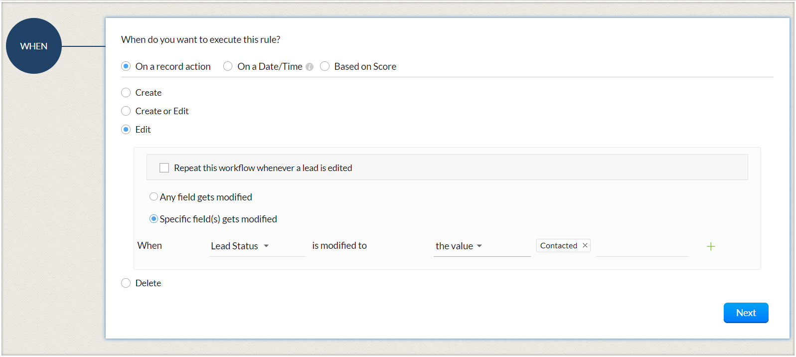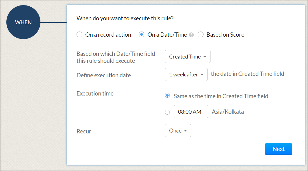 Lorsque de nouveaux leads sont créés dans Zoho CRM, il peut être intéressant d'envoyer automatiquement un e-mail ou une série d'e-mails à des intervalles définis. Vous pouvez également avoir besoin de créer des tâches pour ces nouveaux leads. Aussi, parfois, lorsque des champs spécifiques sont mis à jour, il se peut que vous souhaitiez déclencher un workflow. Cette option d'exécution vous permet de spécifier une action (Créer, Modifier, Supprimer, etc.) en fonction de laquelle des règles de workflow seront déclenchées.