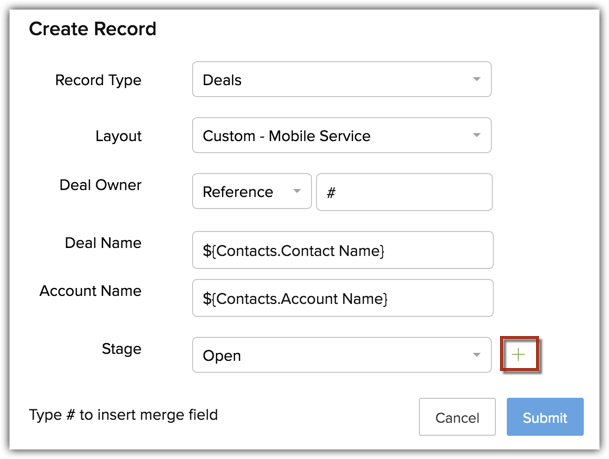 Saisissez les valeurs des champs tels que le nom de l'enregistrement, le montant, etc. Les valeurs que vous saisissez ici seront pré-remplies pour l'enregistrement qui est créé. Par défaut, les champs obligatoires (champs standard et personnalisés) de la mise en page s'affichent ici. Vous pouvez également ajouter les autres champs présents dans la mise en page et saisir une valeur. Vous pouvez saisir les valeurs ou utiliser les champs de fusion. Par exemple, les valeurs du champ E-mail peuvent être saisies à l'aide des champs de fusion.