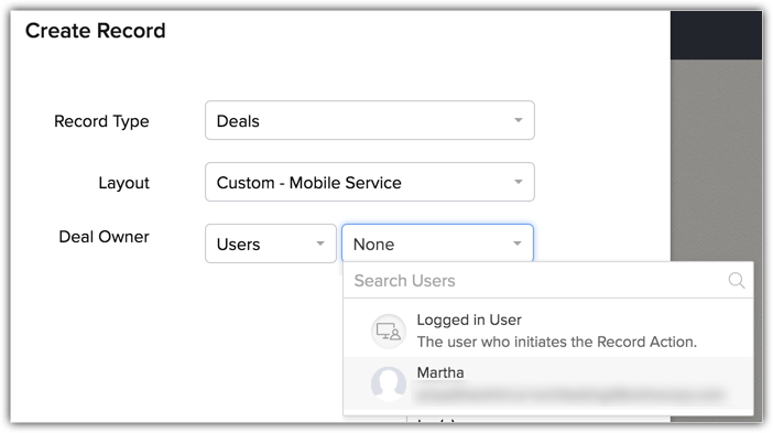Sélectionnez le propriétaire de l'enregistrement. Vous pouvez sélectionner l'utilisateur connecté (la personne qui crée la règle de workflow) ou tout autre utilisateur CRM.