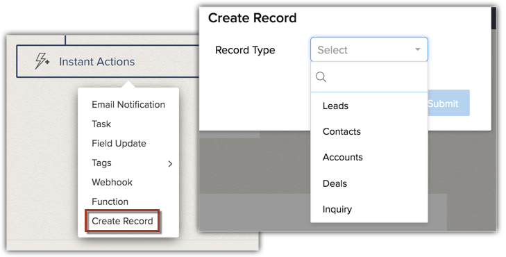 Une règle de workflow n'est utile que si une action y est associée. Ces actions comprennent les notifications par e-mail, les tâches, les mises à jour de champ, les webhooks et les fonctions personnalisées et la création d'enregistrements. À l'exception de l'option Créer un enregistrement, toutes les autres actions sont regroupées sous l' onglet Actions et peuvent être soit Instantanées , soit Planifiées. Une fois créées, ces actions peuvent être associées à de nombreuses règles.