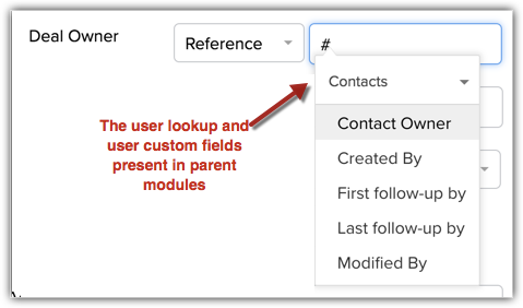 De même, vous pouvez sélectionner un utilisateur de référence. C'est-à-dire tout champ de recherche utilisateur que vous avez ajouté dans la mise en page. Par exemple, si le module Contacts dispose d'une recherche utilisateur pour Comptes et Fournisseurs, vous pouvez sélectionner un utilisateur dans ces modules de recherche comme propriétaire de l'enregistrement. Vous pouvez même sélectionner un utilisateur dans le champ Utilisateur personnalisé (seul le champ Utilisateur unique peut être utilisé) comme propriétaire d'enregistrement, mais il doit s'agir d'un champ Utilisateur unique.