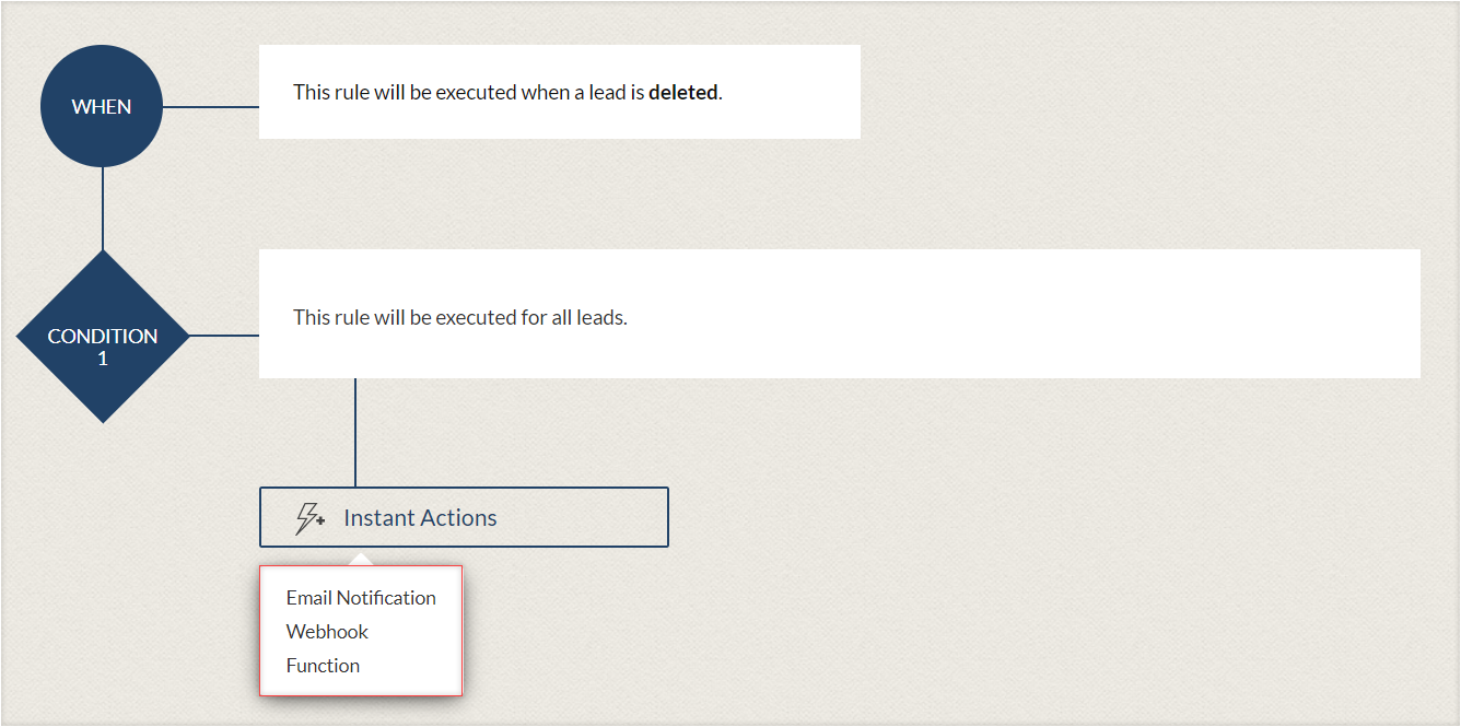Les actions instantanées comprennent les notifications par e-mail, les tâches, les mises à jour de champ, les webhooks, les fonctions personnalisées et la création d'enregistrements. Ces actions seront déclenchées immédiatement lorsque la règle est exécutée. Il y a deux options pour associer ces actions.