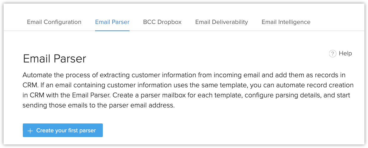 Dans Zoho CRM, vous pouvez créer jusqu'à 20 analyseurs d'e-mails, mais seulement 10 analyseurs peuvent être actifs simultanément.